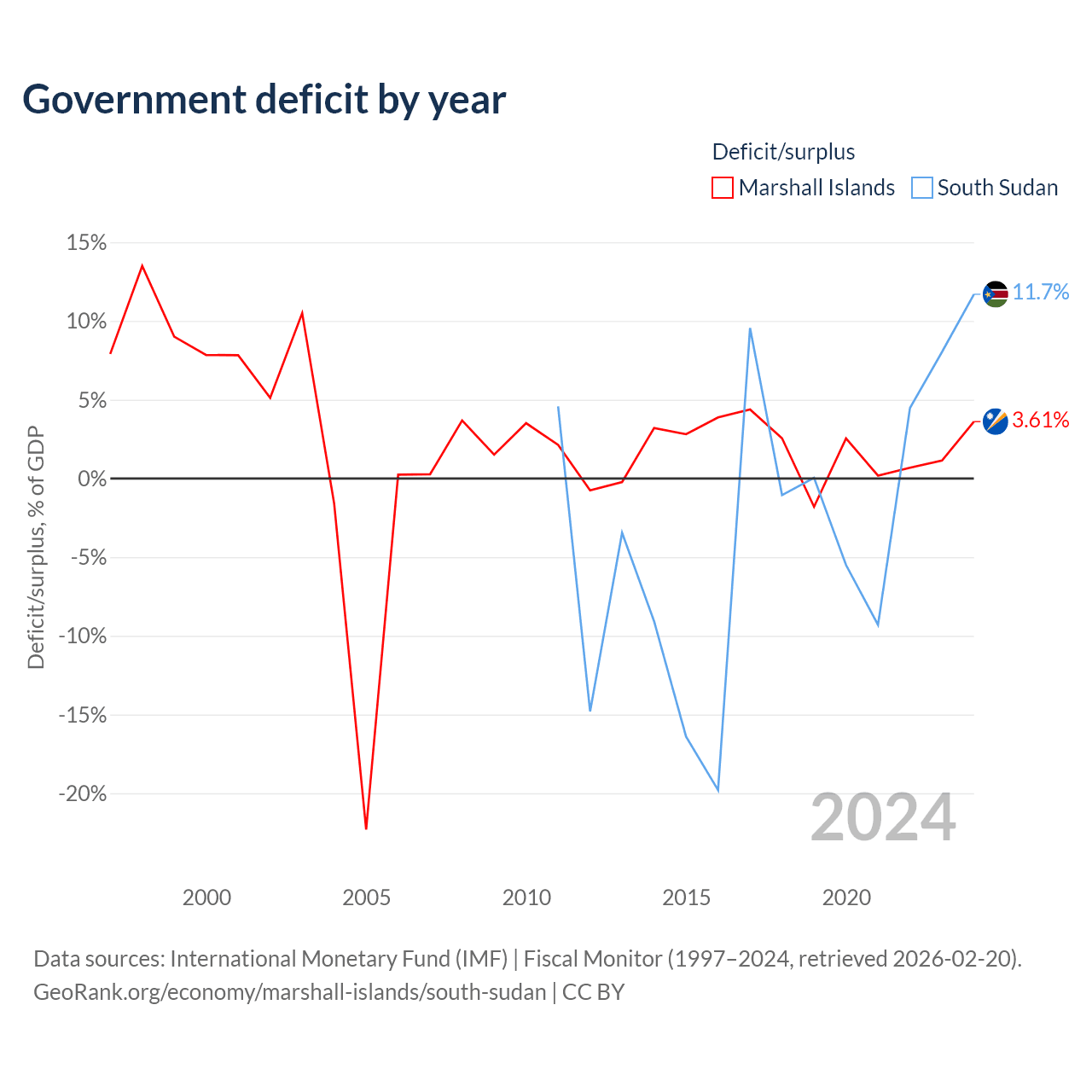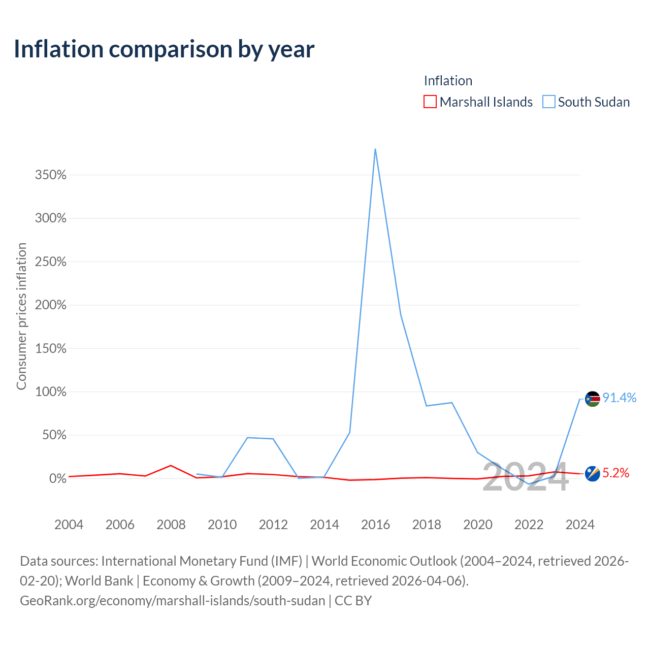 Over the past 16 years, the Marshall Islands has recorded an average annual inflation rate of 1.81%, compared with 63.7% in South Sudan. In 2024, inflation was 5.2% in the Marshall Islands and 91.4% in South Sudan.
