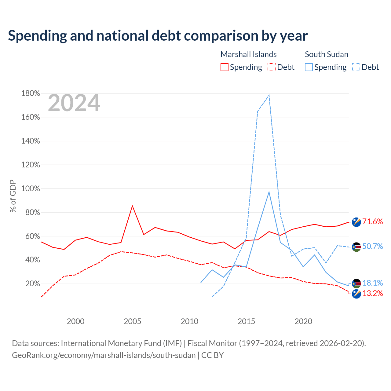 The Marshall Islands has $38.4M in government debt (13.2% of GDP), compared to $7.04B (50.7% of GDP) in South Sudan.