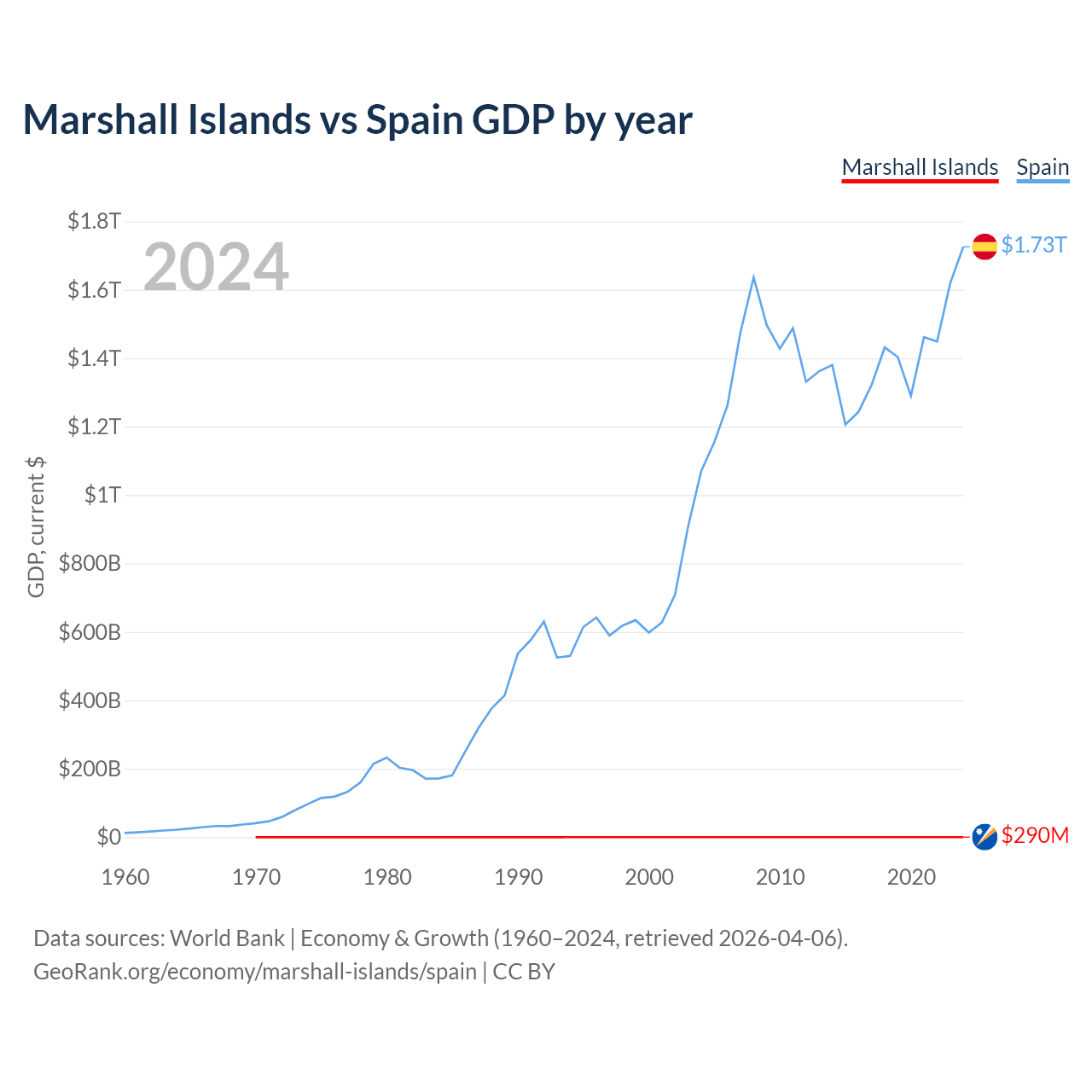 The Marshall Islands has a GDP of $290M compared to $1.73T for Spain, ranking 193/197 and 15/197 by economy size, respectively.