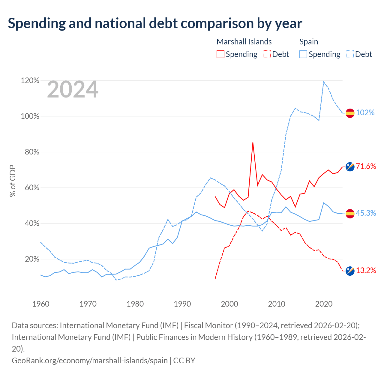 The Marshall Islands has $38.4M in government debt (13.2% of GDP), compared to $1.75T (101.6% of GDP) in Spain.