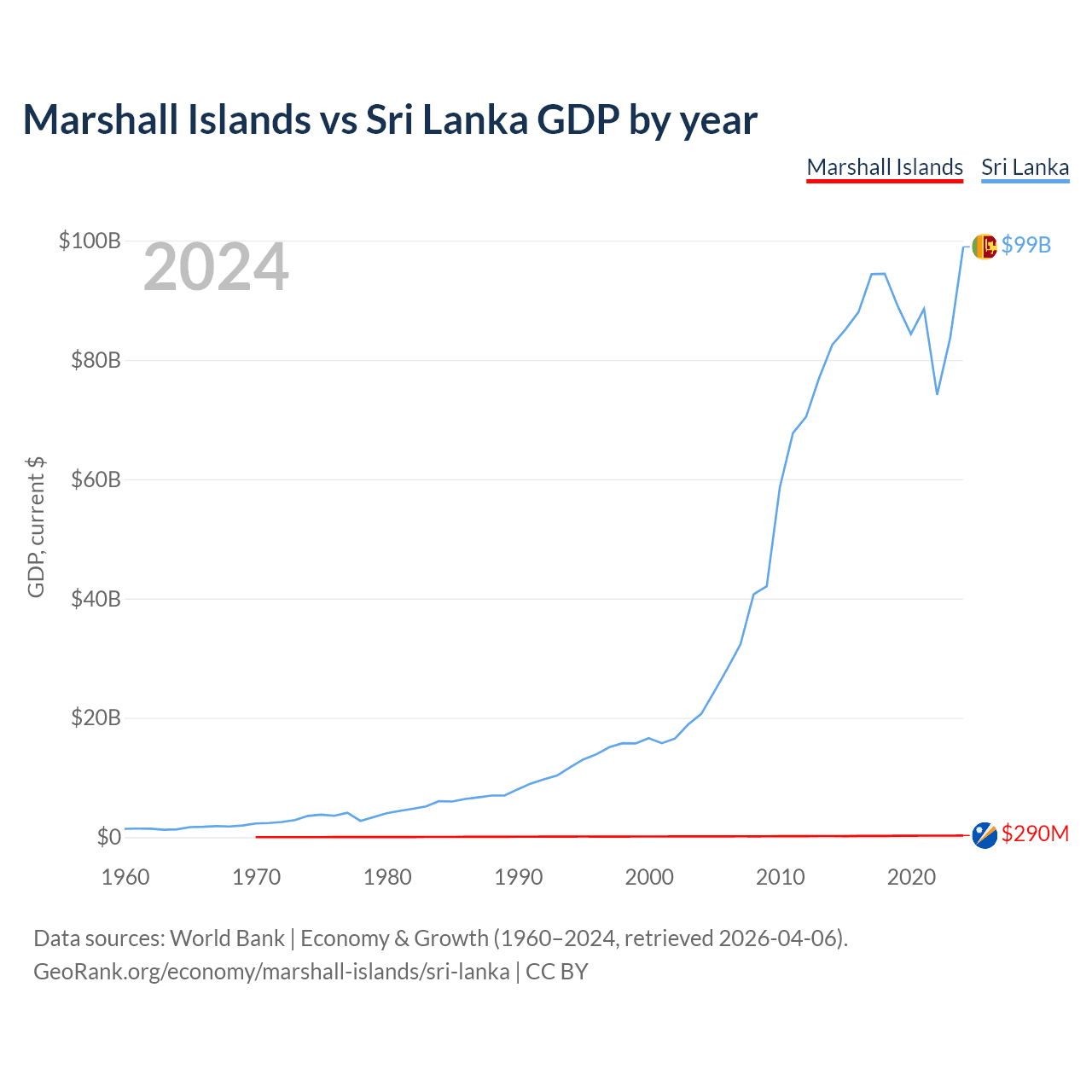 The Marshall Islands has a GDP of $290M compared to $99B for Sri Lanka, ranking 193/197 and 72/197 by economy size, respectively.