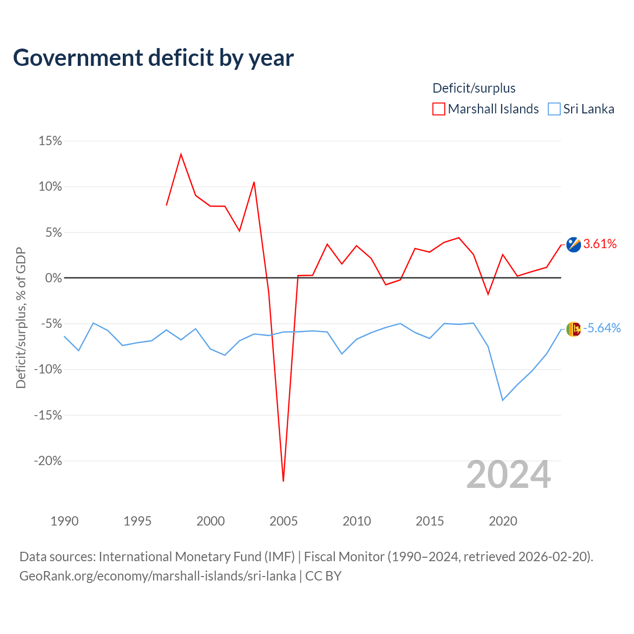 The Marshall Islands has $38.4M in government debt (13.2% of GDP), compared to $99.8B (100.8% of GDP) in Sri Lanka.