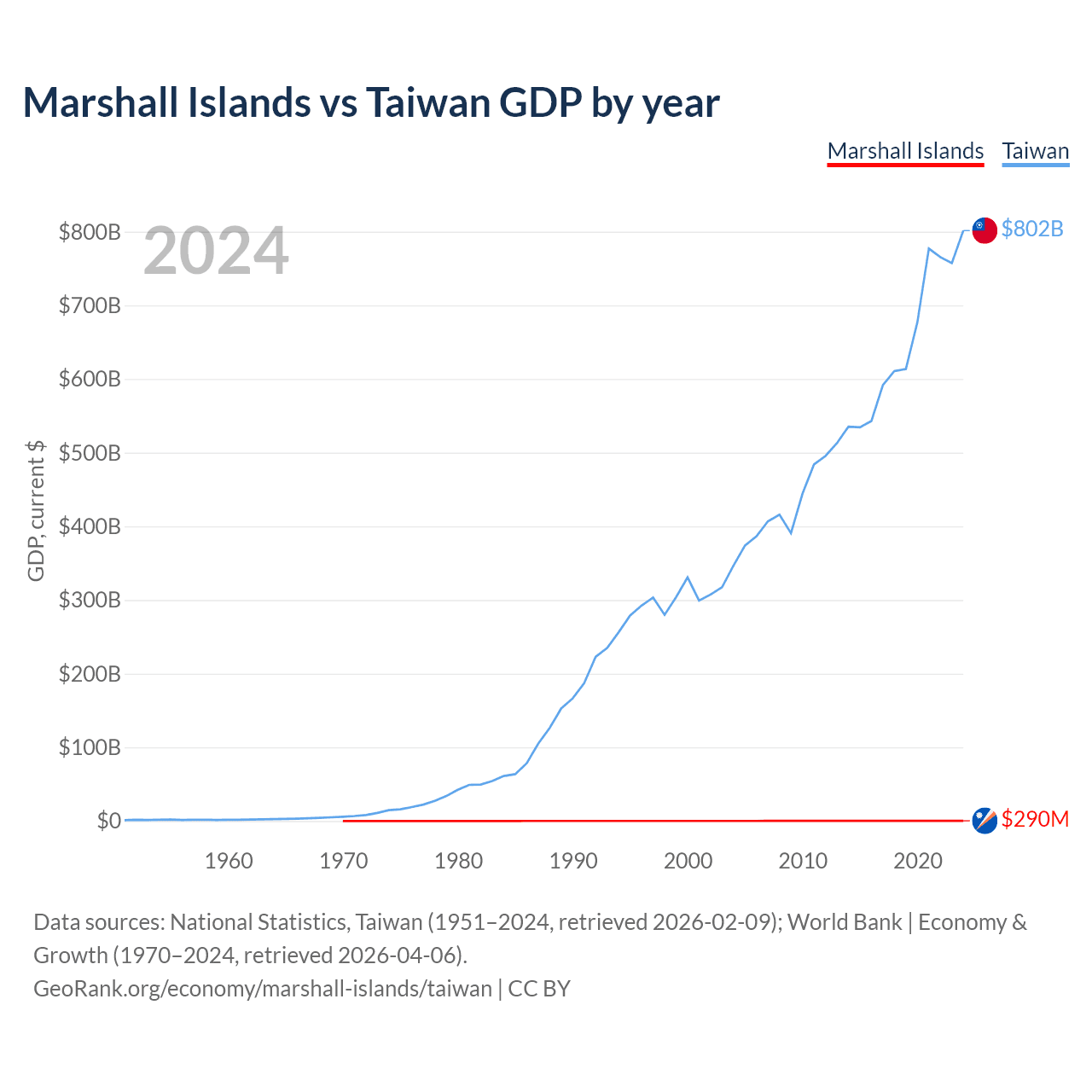 The Marshall Islands has a GDP of $290M compared to $802B for Taiwan, ranking 193/197 and 22/197 by economy size, respectively.