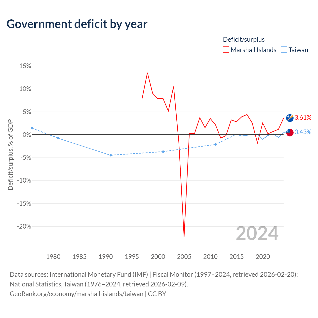 The Marshall Islands has $38.4M in government debt (13.2% of GDP), compared to $211B (26.3% of GDP) in Taiwan.
