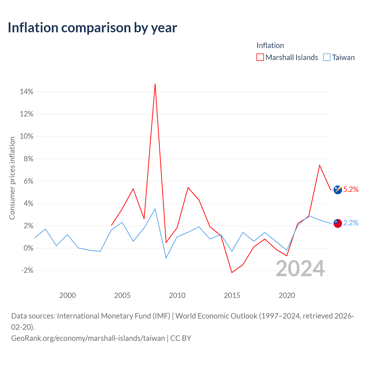 Over the past 21 years, the Marshall Islands has recorded an average annual inflation rate of 2.72%, compared with 1.35% in Taiwan. In 2024, inflation was 5.2% in the Marshall Islands and 2.2% in Taiwan.