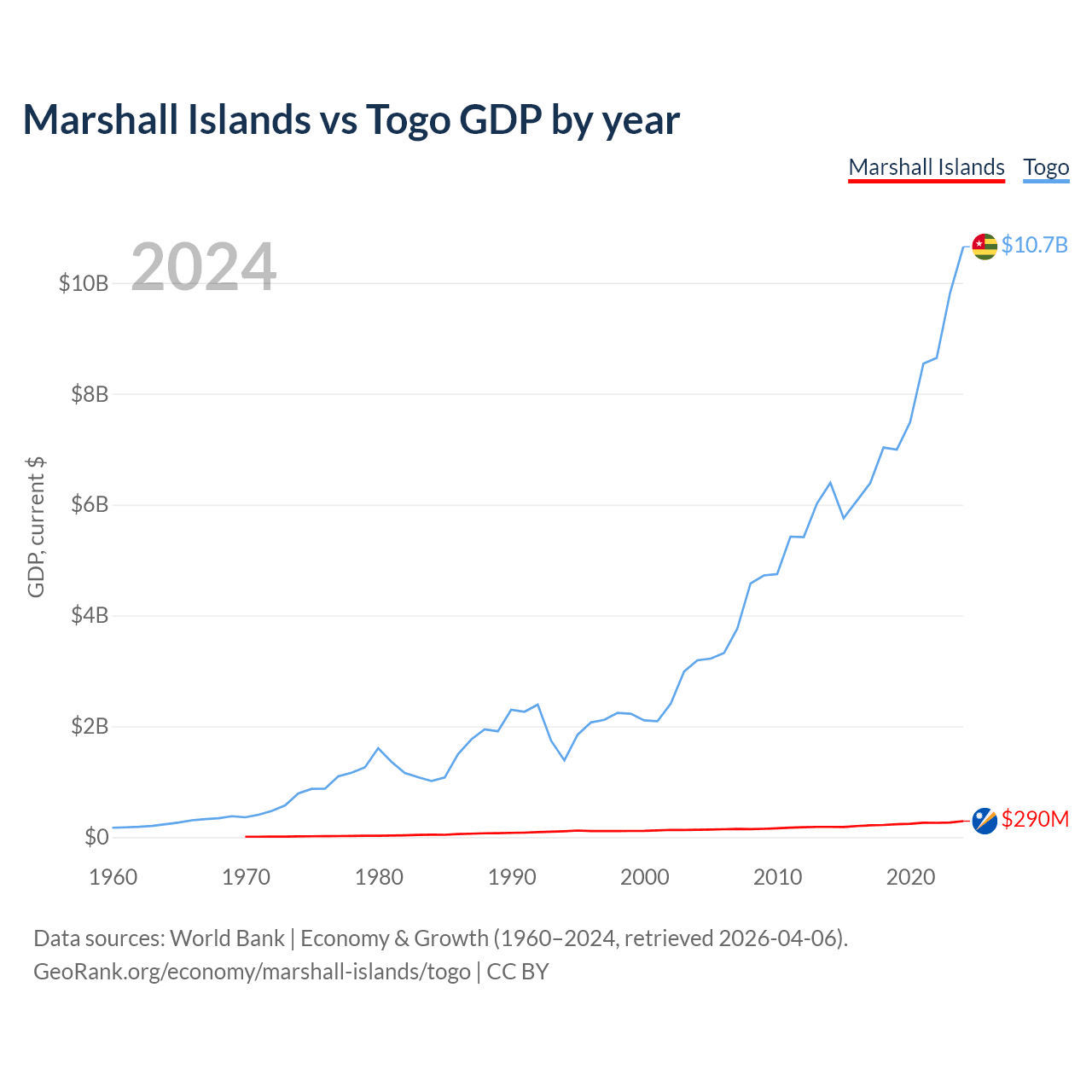 The Marshall Islands has a GDP of $290M compared to $10.7B for Togo, ranking 193/197 and 154/197 by economy size, respectively.