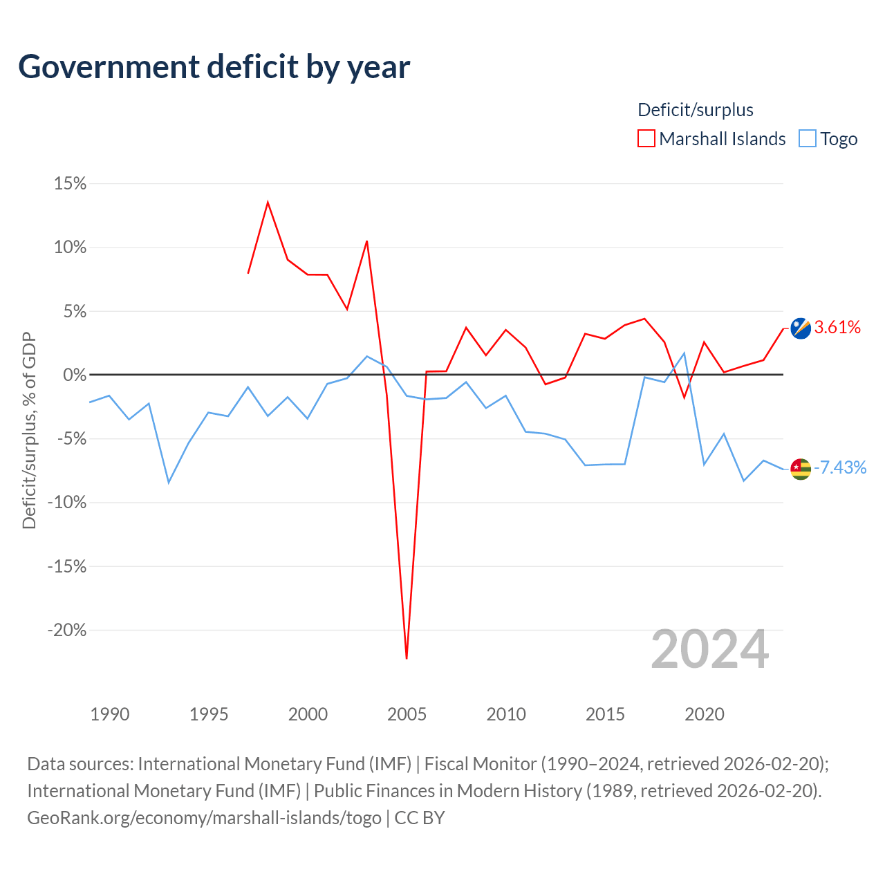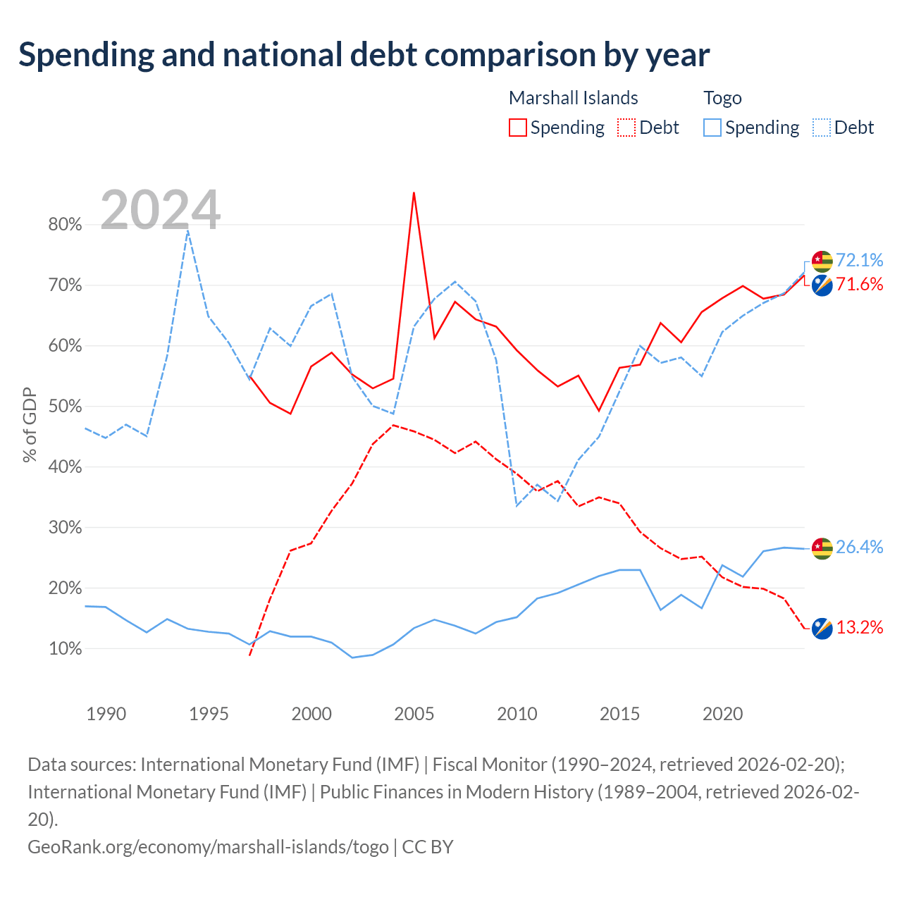 The Marshall Islands has $38.4M in government debt (13.2% of GDP), compared to $7.68B (72.1% of GDP) in Togo.
