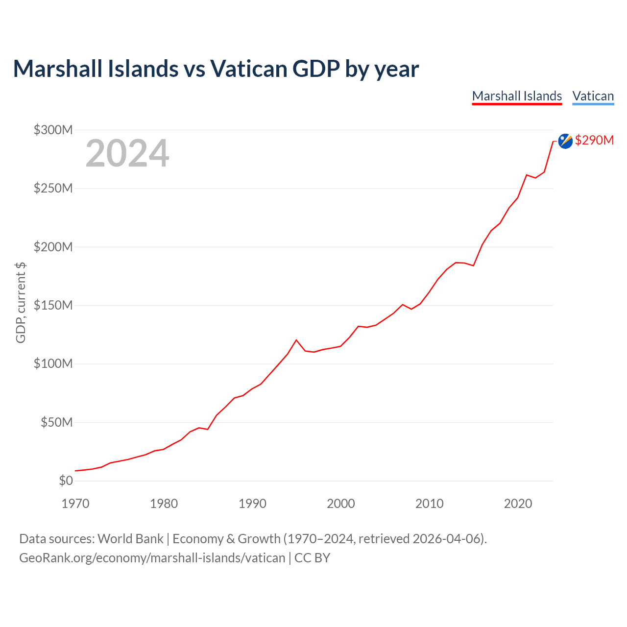 The Marshall Islands has a GDP of $290M compared to $19.8M for the Vatican, ranking 193/197 and 197/197 by economy size, respectively.