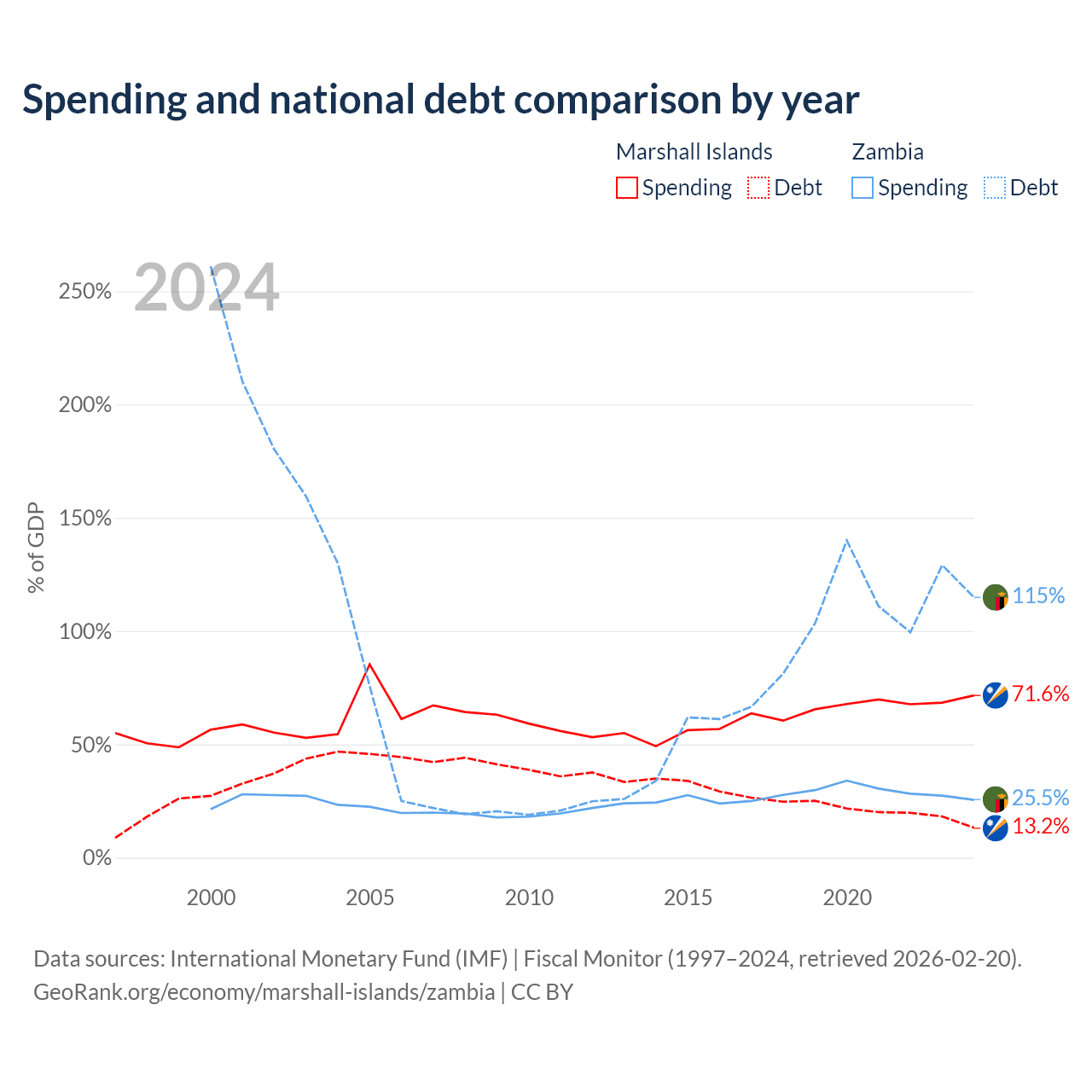 The Marshall Islands has $38.4M in government debt (13.2% of GDP), compared to $29.1B (114.9% of GDP) in Zambia.
