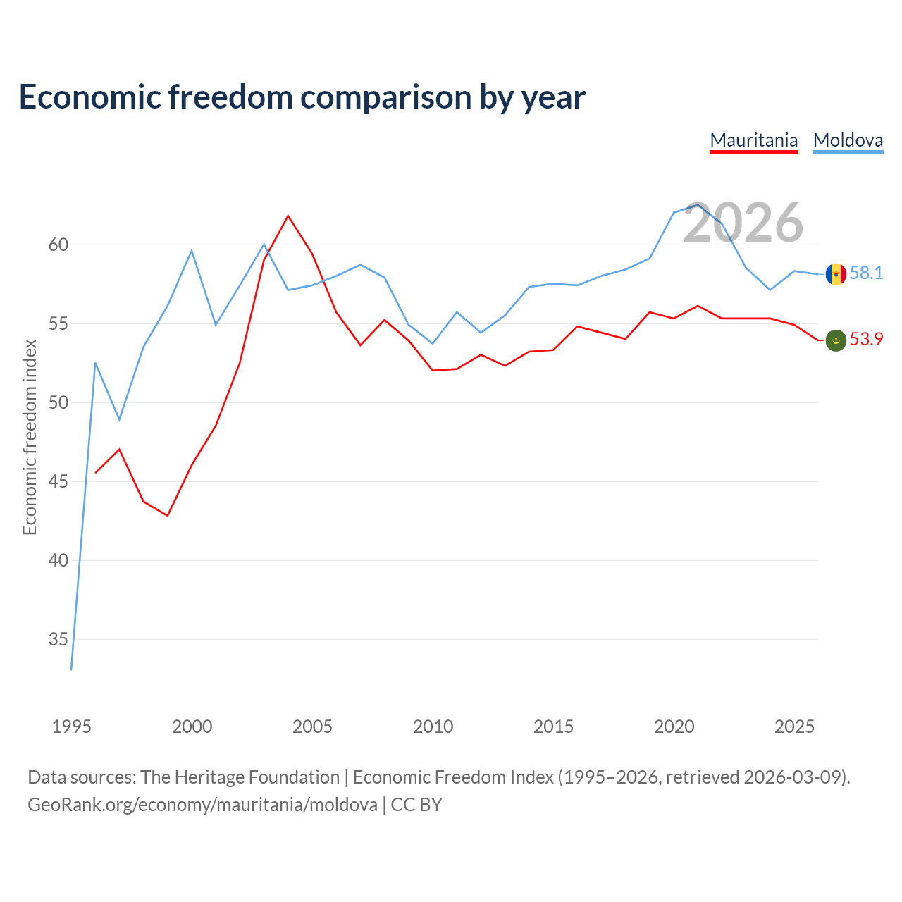 The Economic Freedom Index for Mauritania is 53.9, ranking 136/197, compared to 58.1 for Moldova, ranking 112/197. The chart above displays a comparison of annual changes in economic freedom indexes.