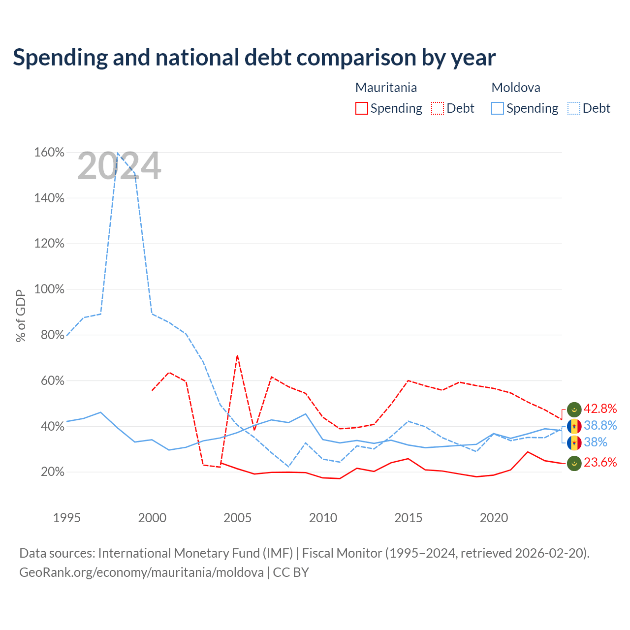 Mauritania has $4.67B in government debt (42.8% of GDP), compared to $7.06B (38.8% of GDP) in Moldova.