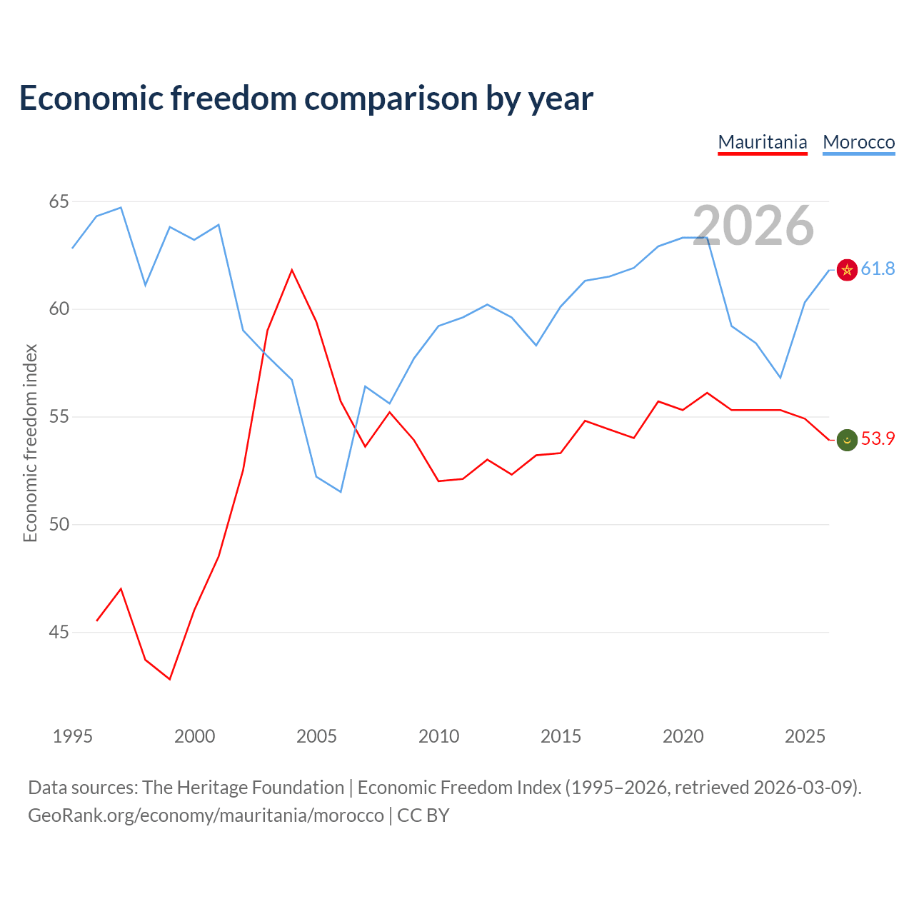 The Economic Freedom Index for Mauritania is 53.9, ranking 136/197, compared to 61.8 for Morocco, ranking 91/197. The chart above displays a comparison of annual changes in economic freedom indexes.