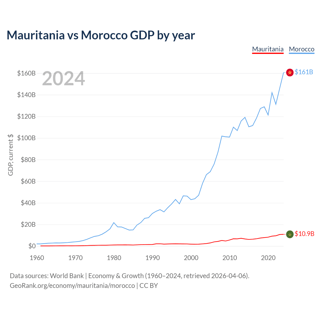 Mauritania has a GDP of $10.9B compared to $161B for Morocco, ranking 153/197 and 58/197 by economy size, respectively.