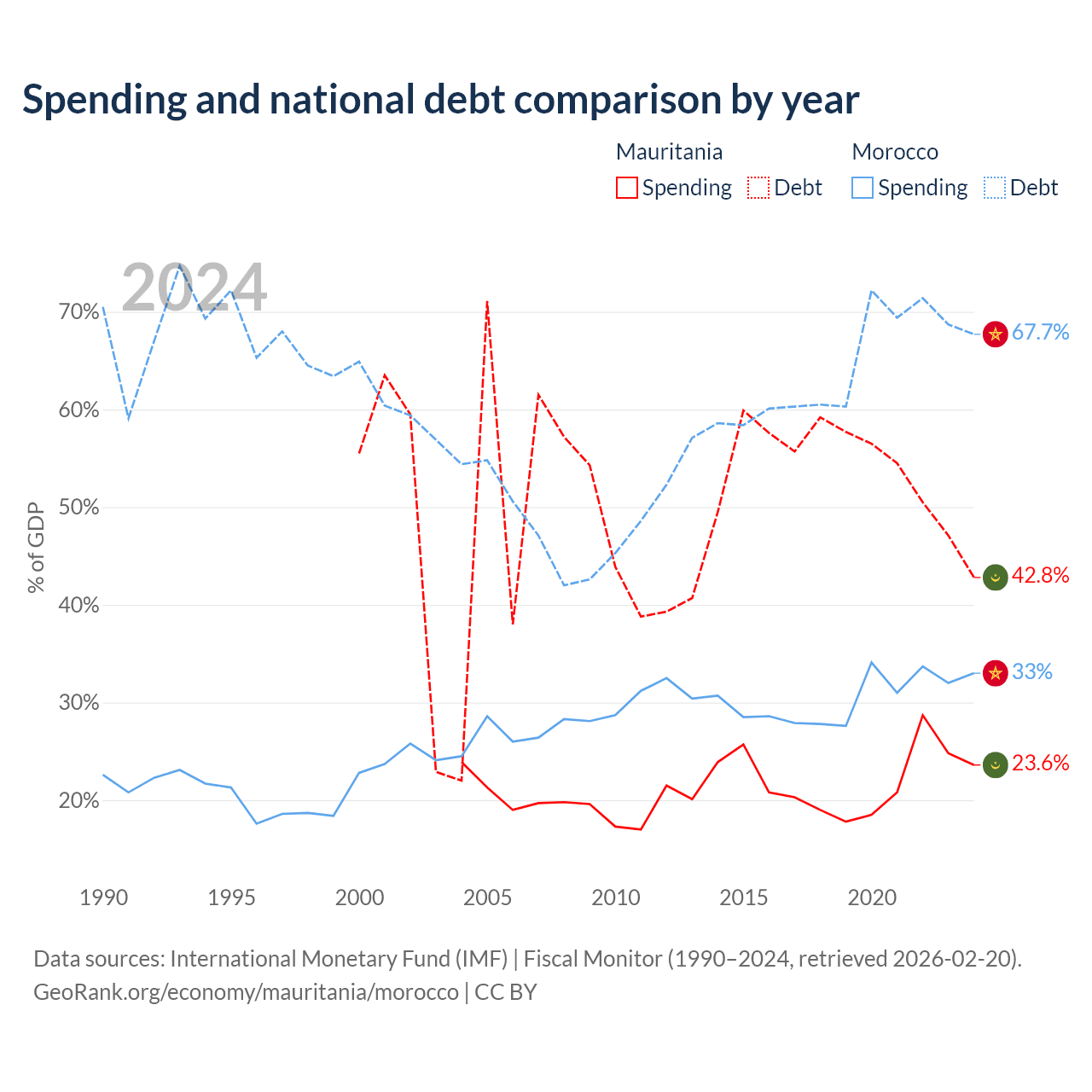 Mauritania has $4.67B in government debt (42.8% of GDP), compared to $109B (67.7% of GDP) in Morocco.