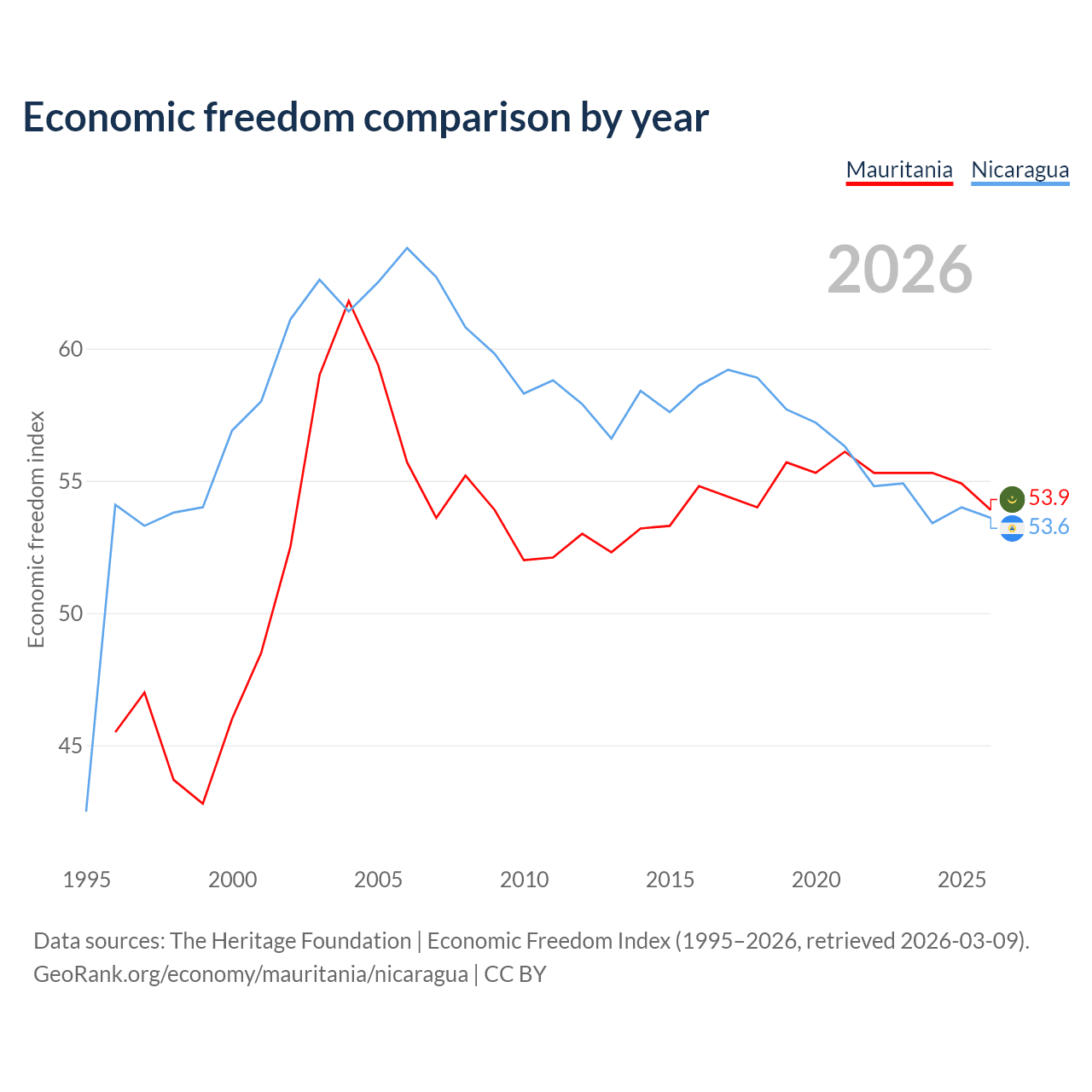 The Economic Freedom Index for Mauritania is 53.9, ranking 136/197, compared to 53.6 for Nicaragua, ranking 139/197. The chart above displays a comparison of annual changes in economic freedom indexes.