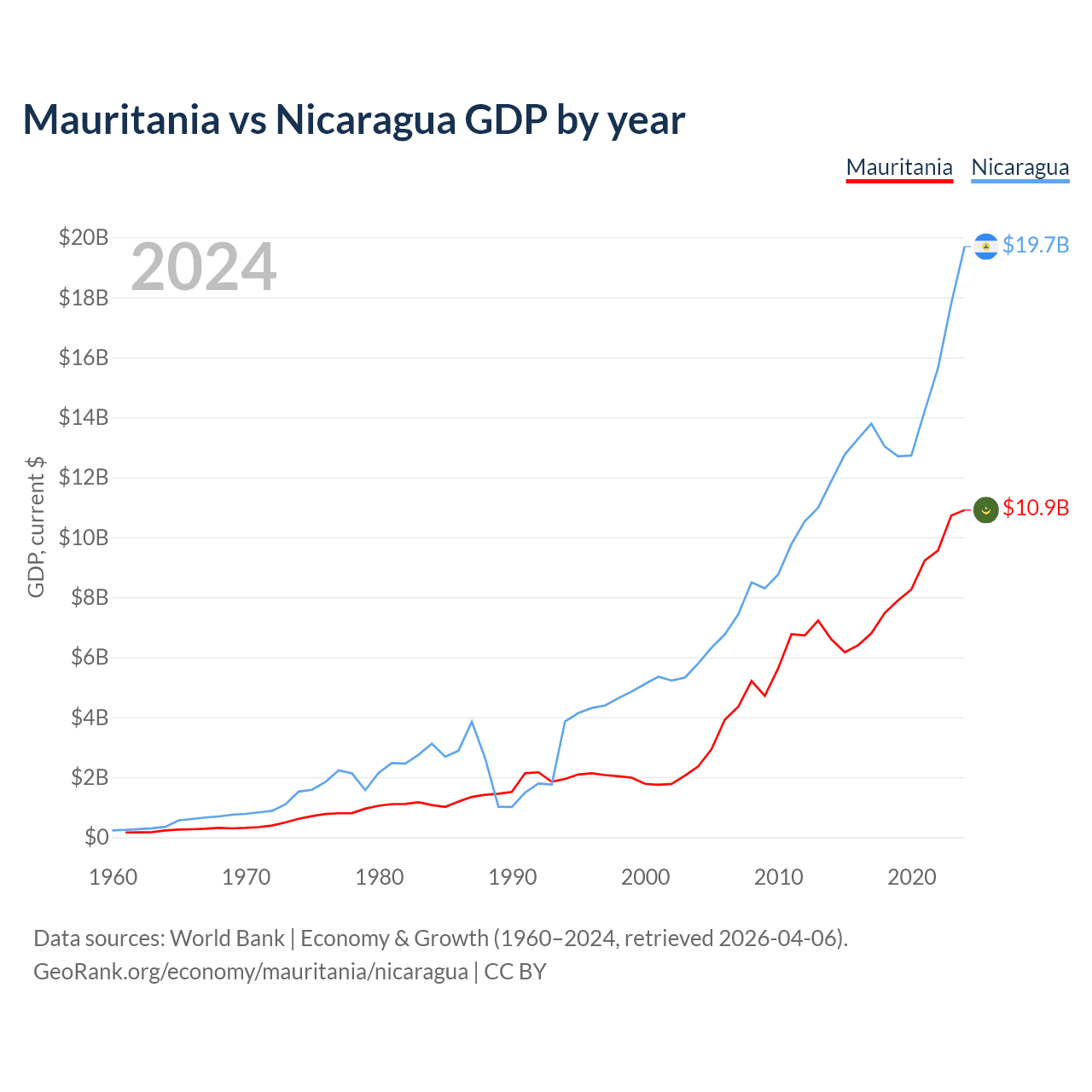 Mauritania has a GDP of $10.9B compared to $19.7B for Nicaragua, ranking 153/197 and 131/197 by economy size, respectively.