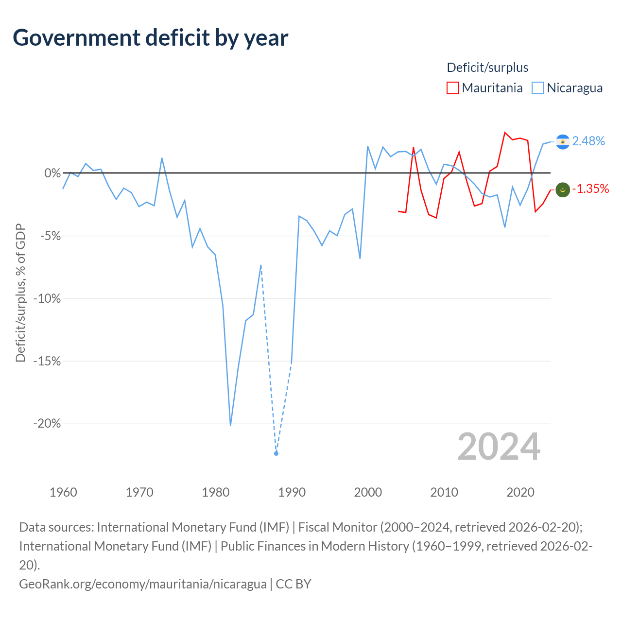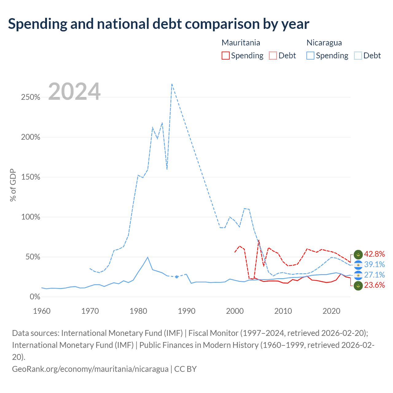 Mauritania has $4.67B in government debt (42.8% of GDP), compared to $7.71B (39.1% of GDP) in Nicaragua.