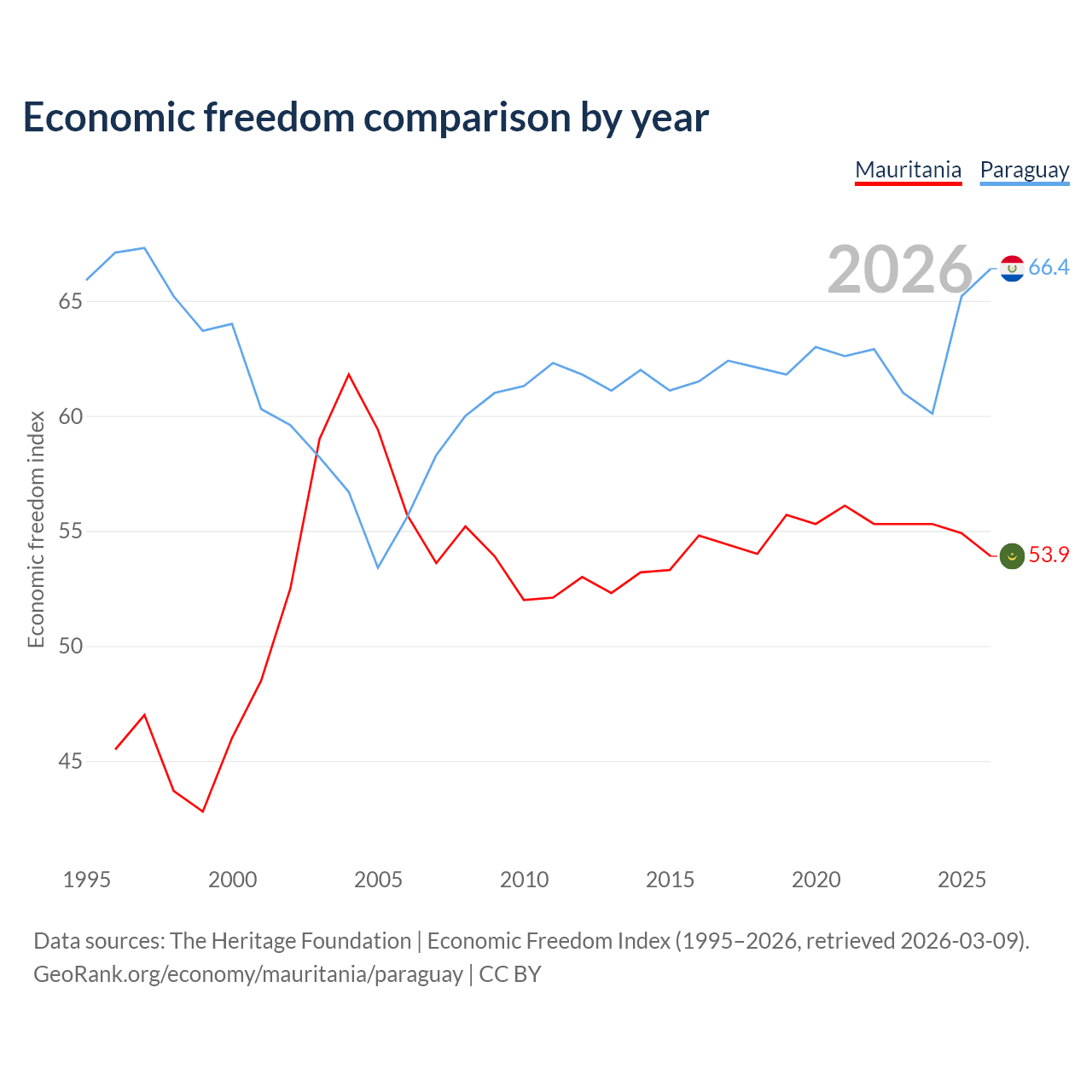 The Economic Freedom Index for Mauritania is 53.9, ranking 136/197, compared to 66.4 for Paraguay, ranking 61/197. The chart above displays a comparison of annual changes in economic freedom indexes.