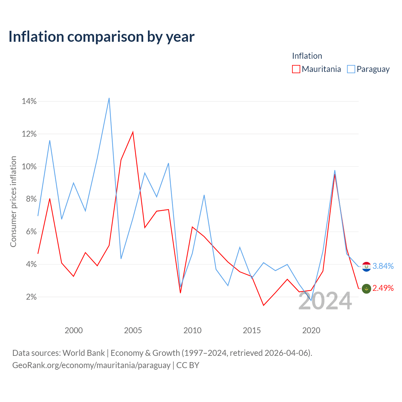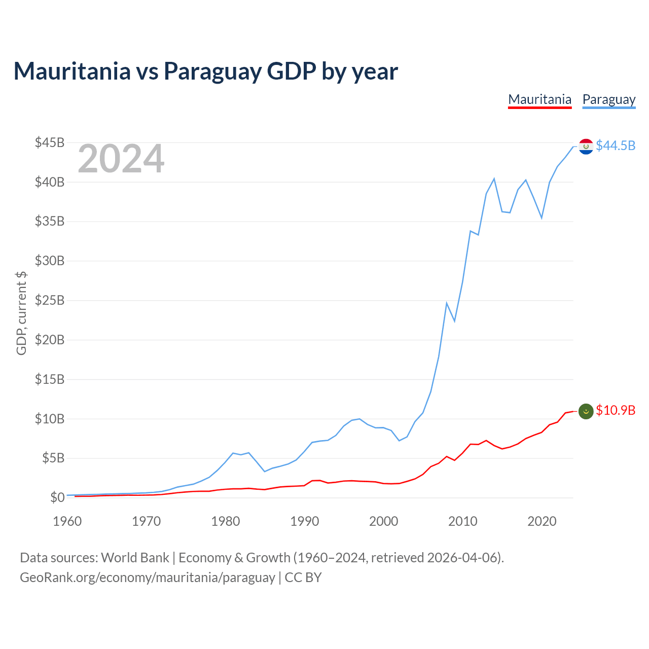 Mauritania has a GDP of $10.9B compared to $44.5B for Paraguay, ranking 153/197 and 98/197 by economy size, respectively.