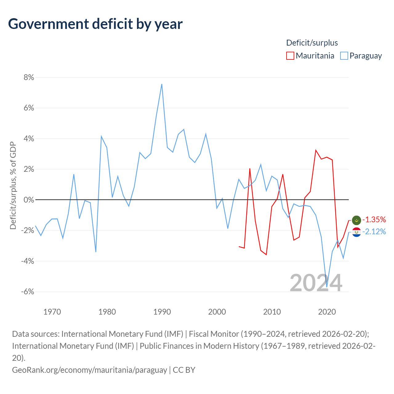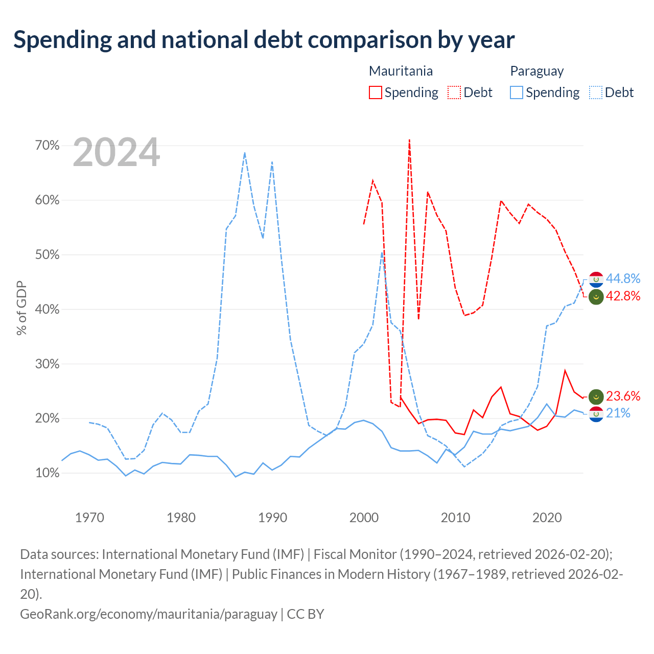 Mauritania has $4.67B in government debt (42.8% of GDP), compared to $19.9B (44.8% of GDP) in Paraguay.