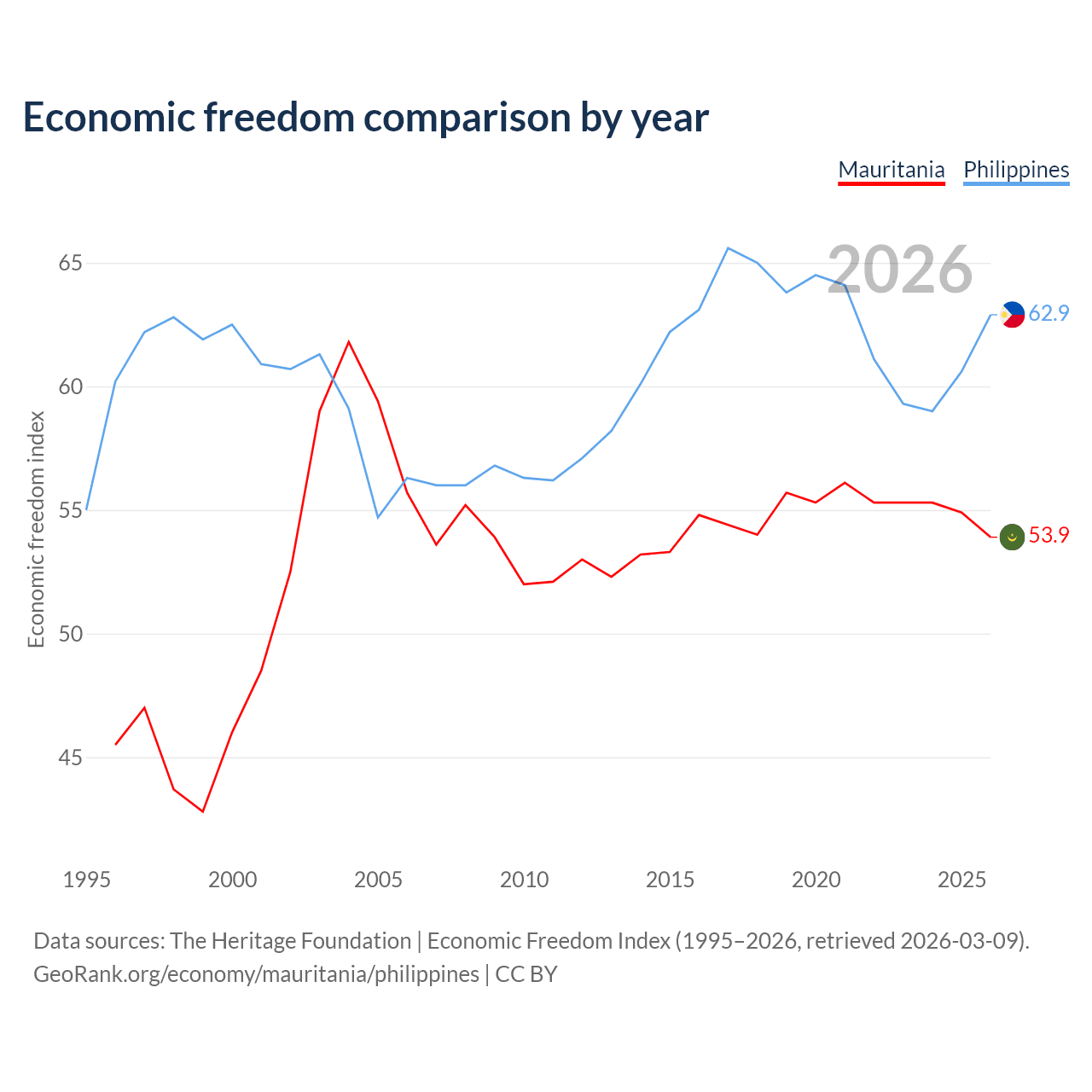 The Economic Freedom Index for Mauritania is 53.9, ranking 136/197, compared to 62.9 for the Philippines, ranking 85/197. The chart above displays a comparison of annual changes in economic freedom indexes.