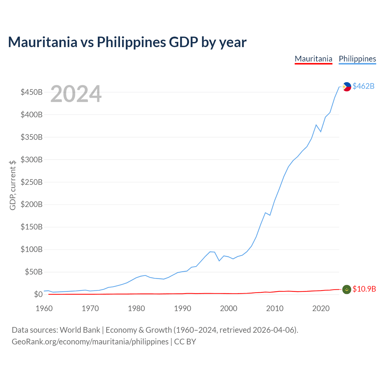 Mauritania has a GDP of $10.9B compared to $462B for the Philippines, ranking 153/197 and 35/197 by economy size, respectively.