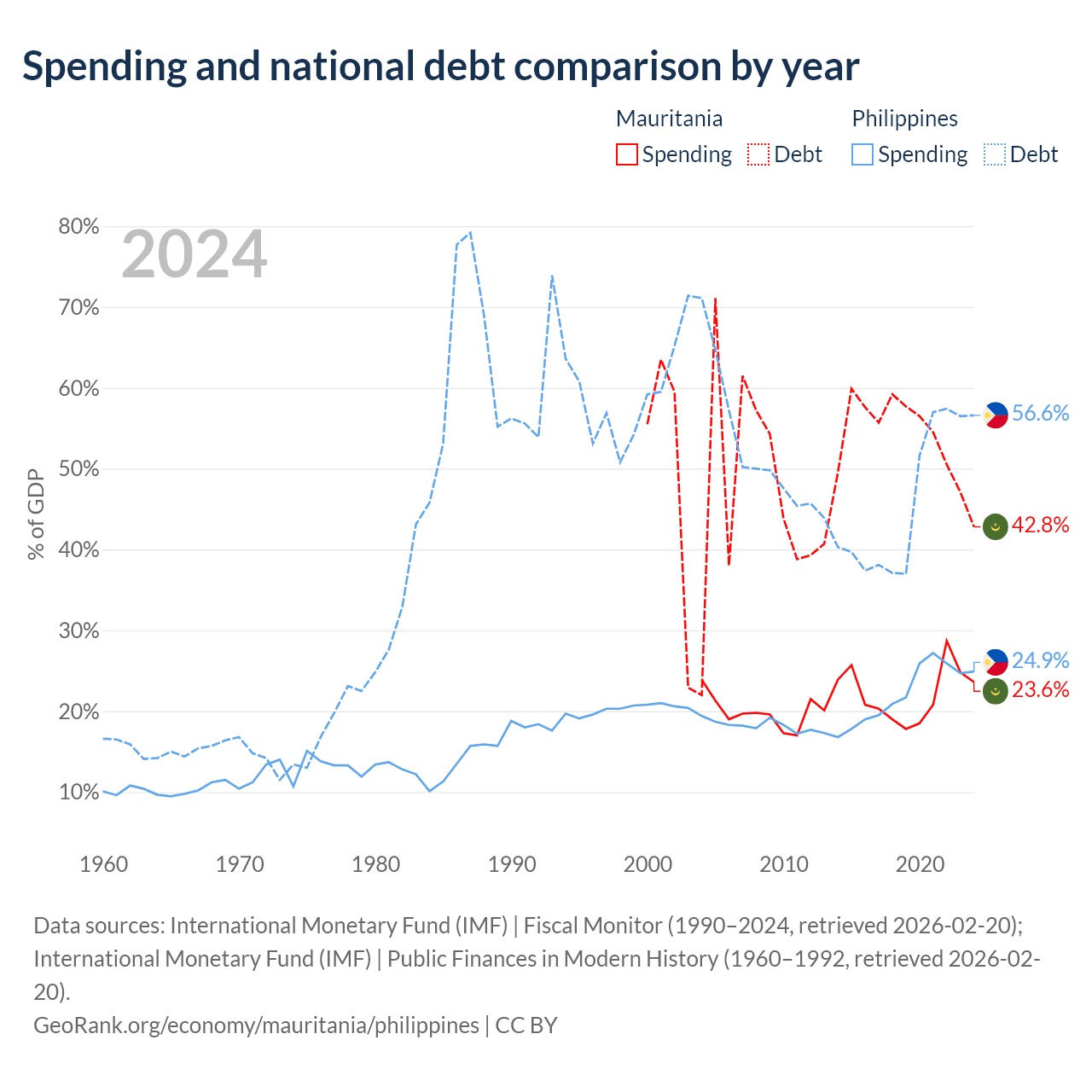 Mauritania has $4.67B in government debt (42.8% of GDP), compared to $261B (56.6% of GDP) in the Philippines.