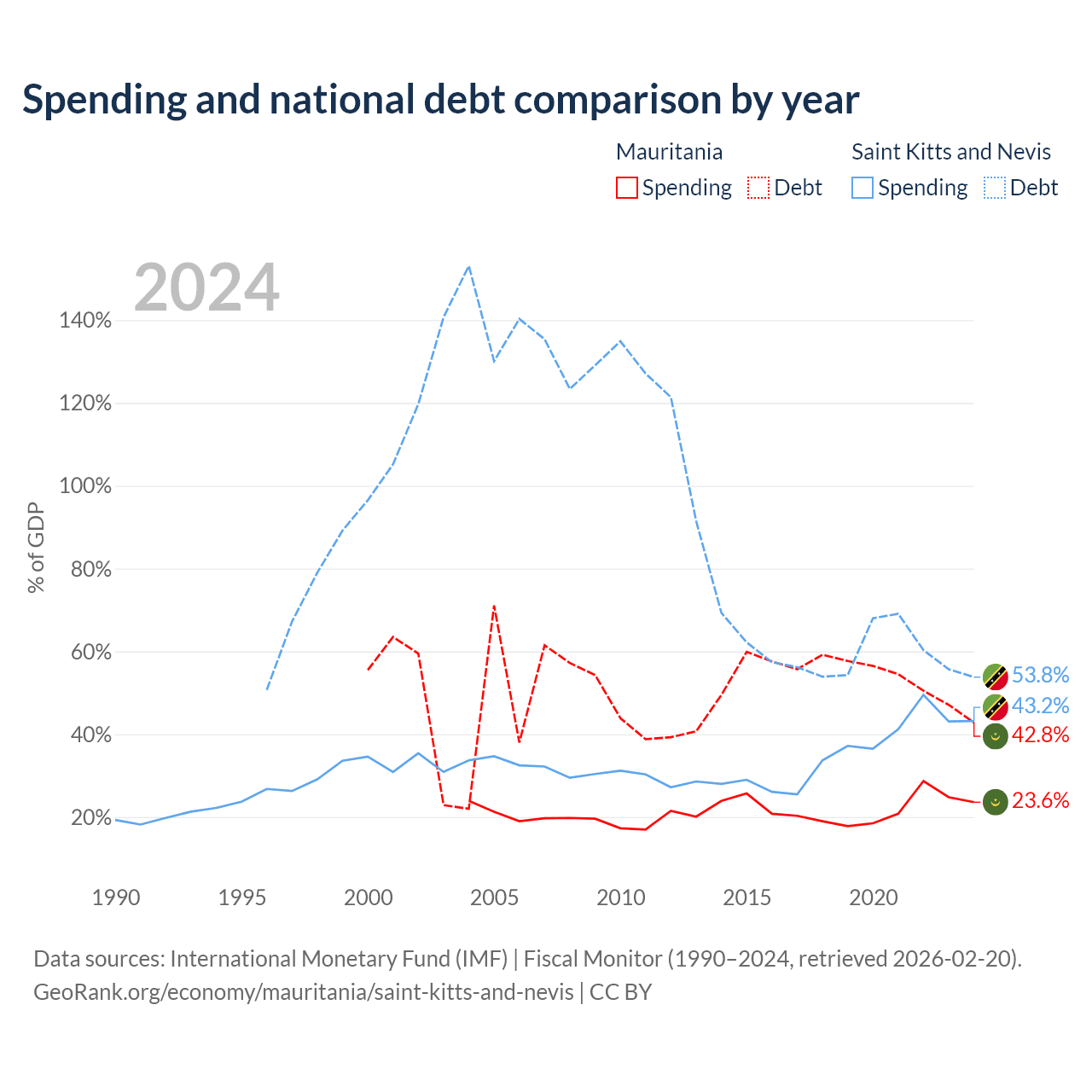 Mauritania has $4.67B in government debt (42.8% of GDP), compared to $604M (53.8% of GDP) in Saint Kitts and Nevis.