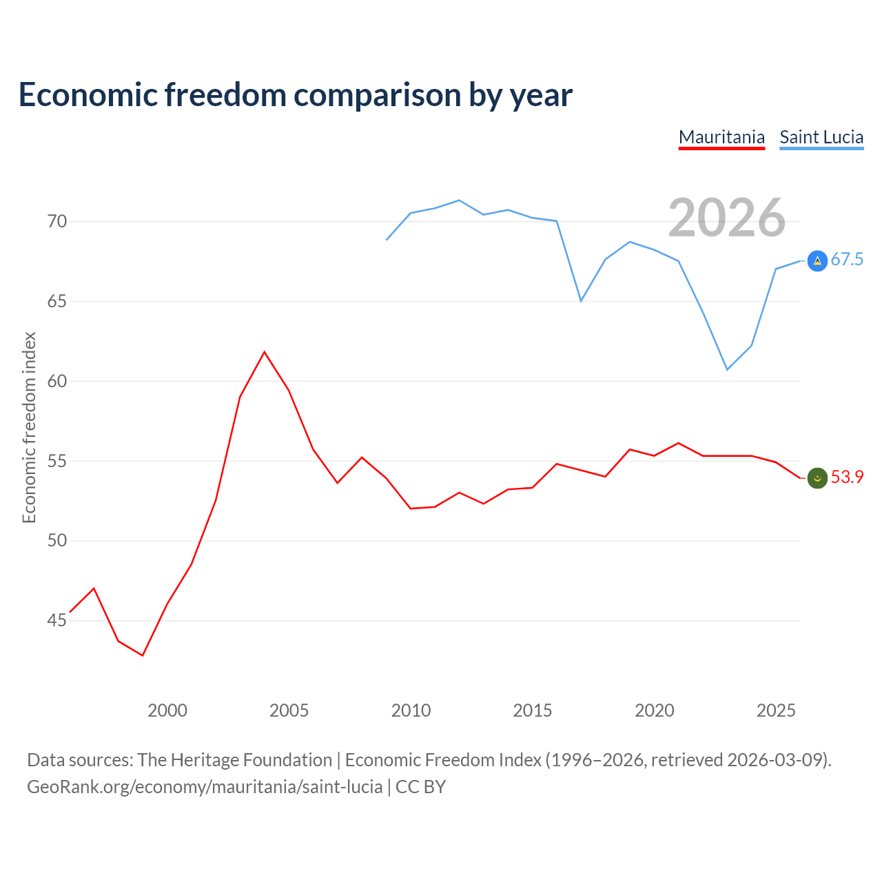 The Economic Freedom Index for Mauritania is 53.9, ranking 136/197, compared to 67.5 for Saint Lucia, ranking 57/197. The chart above displays a comparison of annual changes in economic freedom indexes.