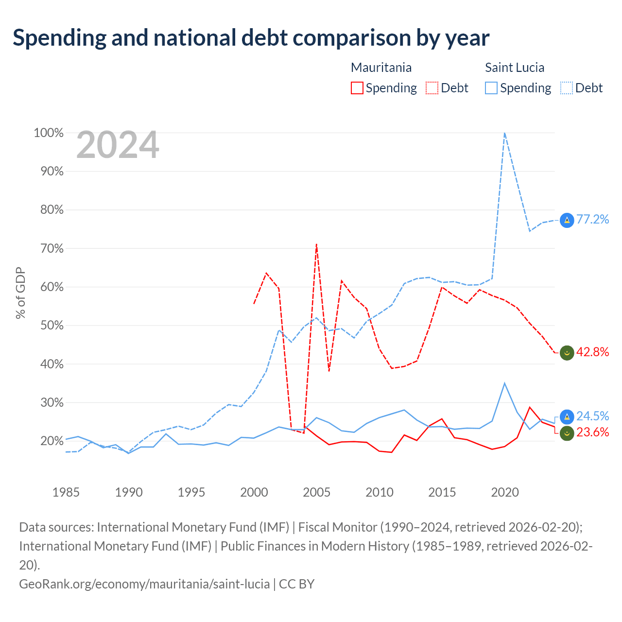 Mauritania has $4.67B in government debt (42.8% of GDP), compared to $1.97B (77.2% of GDP) in Saint Lucia.