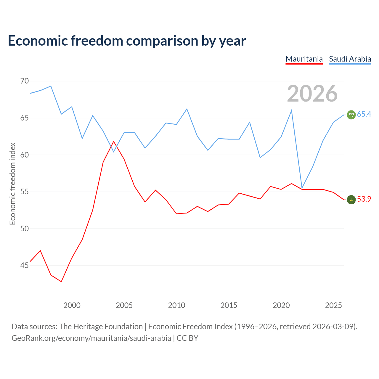 The Economic Freedom Index for Mauritania is 53.9, ranking 136/197, compared to 65.4 for Saudi Arabia, ranking 65/197. The chart above displays a comparison of annual changes in economic freedom indexes.