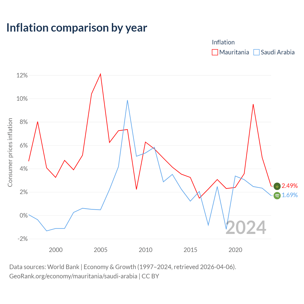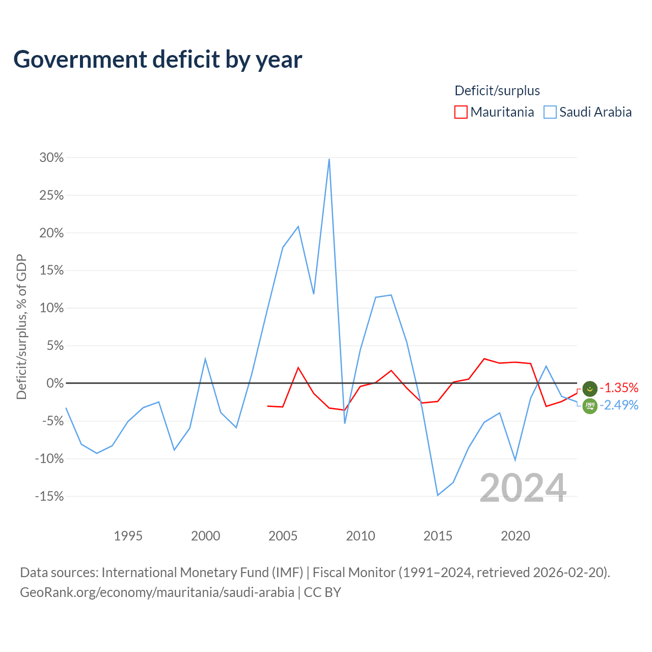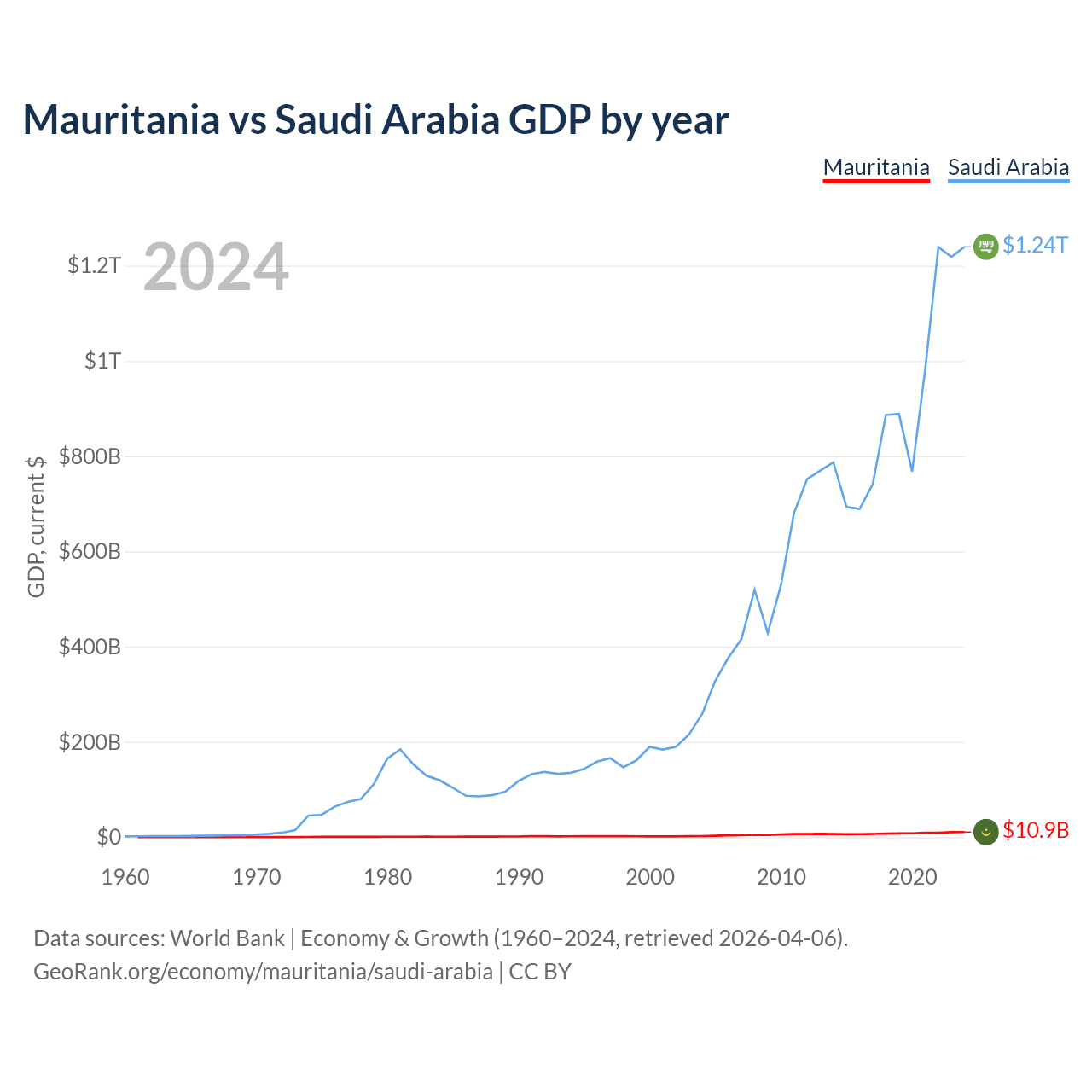 Mauritania has a GDP of $10.9B compared to $1.24T for Saudi Arabia, ranking 153/197 and 18/197 by economy size, respectively.