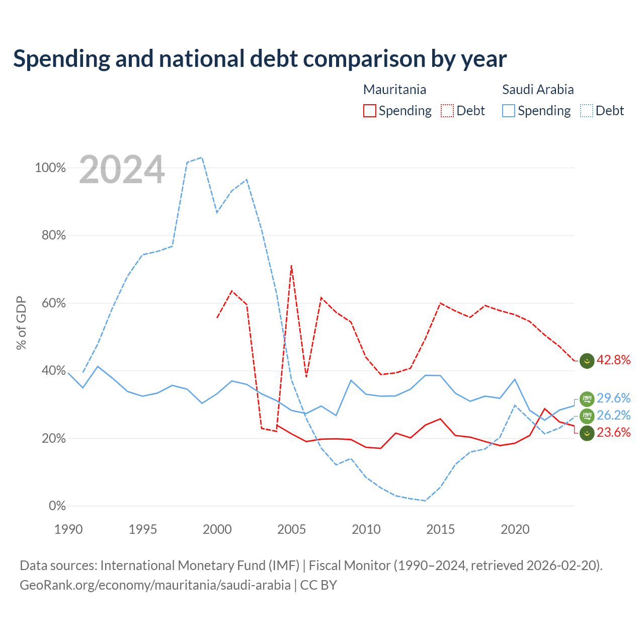 Mauritania has $4.67B in government debt (42.8% of GDP), compared to $324B (26.2% of GDP) in Saudi Arabia.
