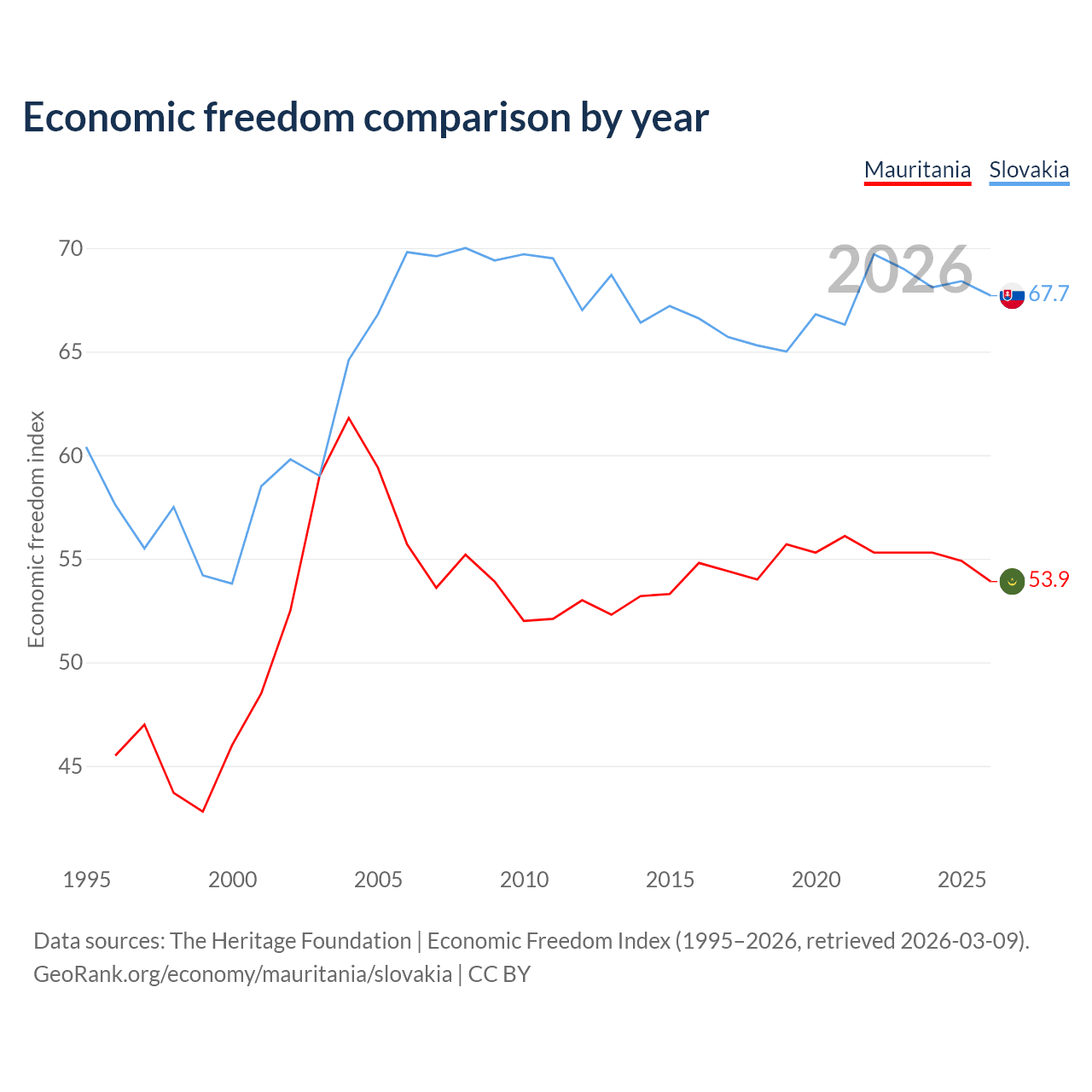 The Economic Freedom Index for Mauritania is 53.9, ranking 136/197, compared to 67.7 for Slovakia, ranking 54/197. The chart above displays a comparison of annual changes in economic freedom indexes.