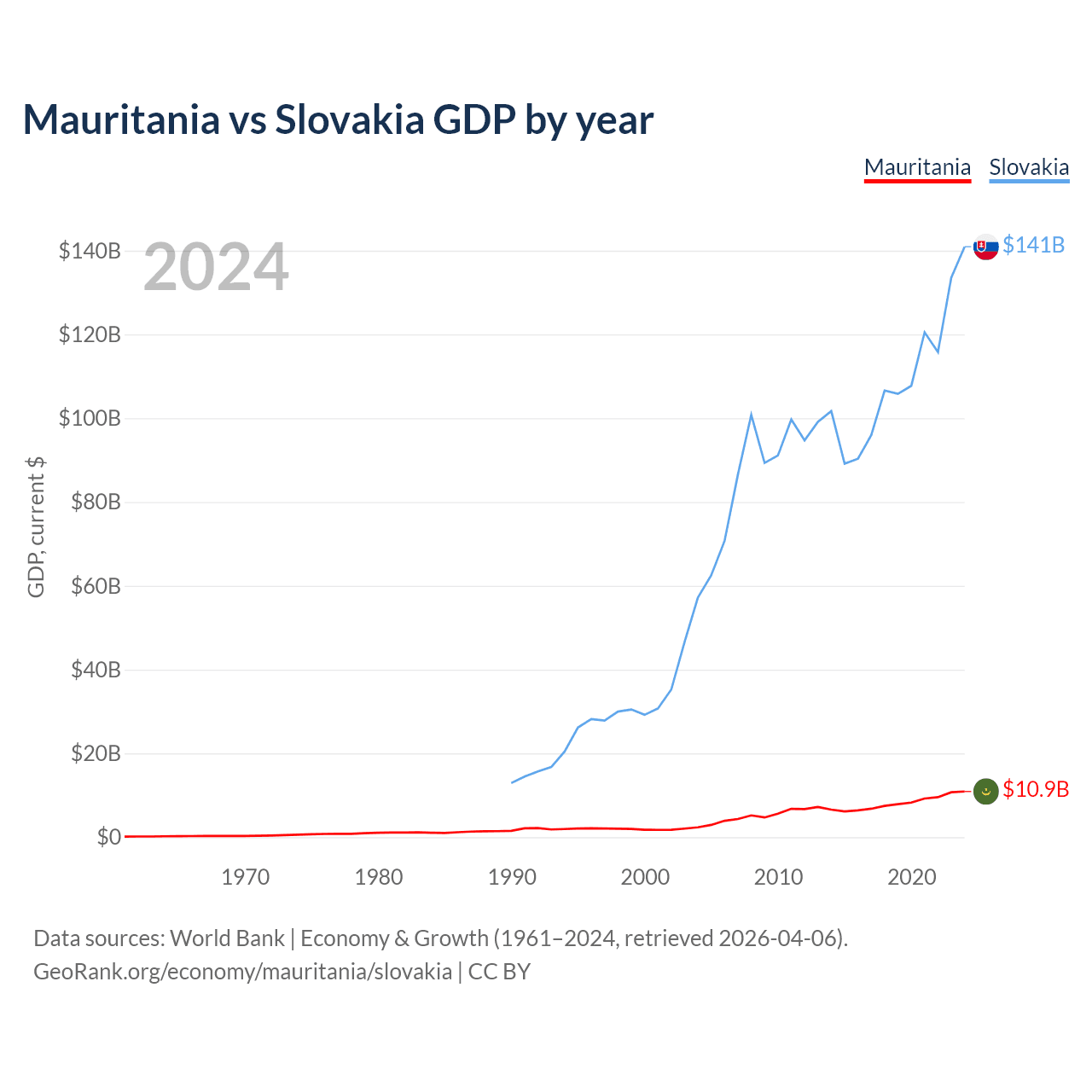 Mauritania has a GDP of $10.9B compared to $141B for Slovakia, ranking 153/197 and 61/197 by economy size, respectively.