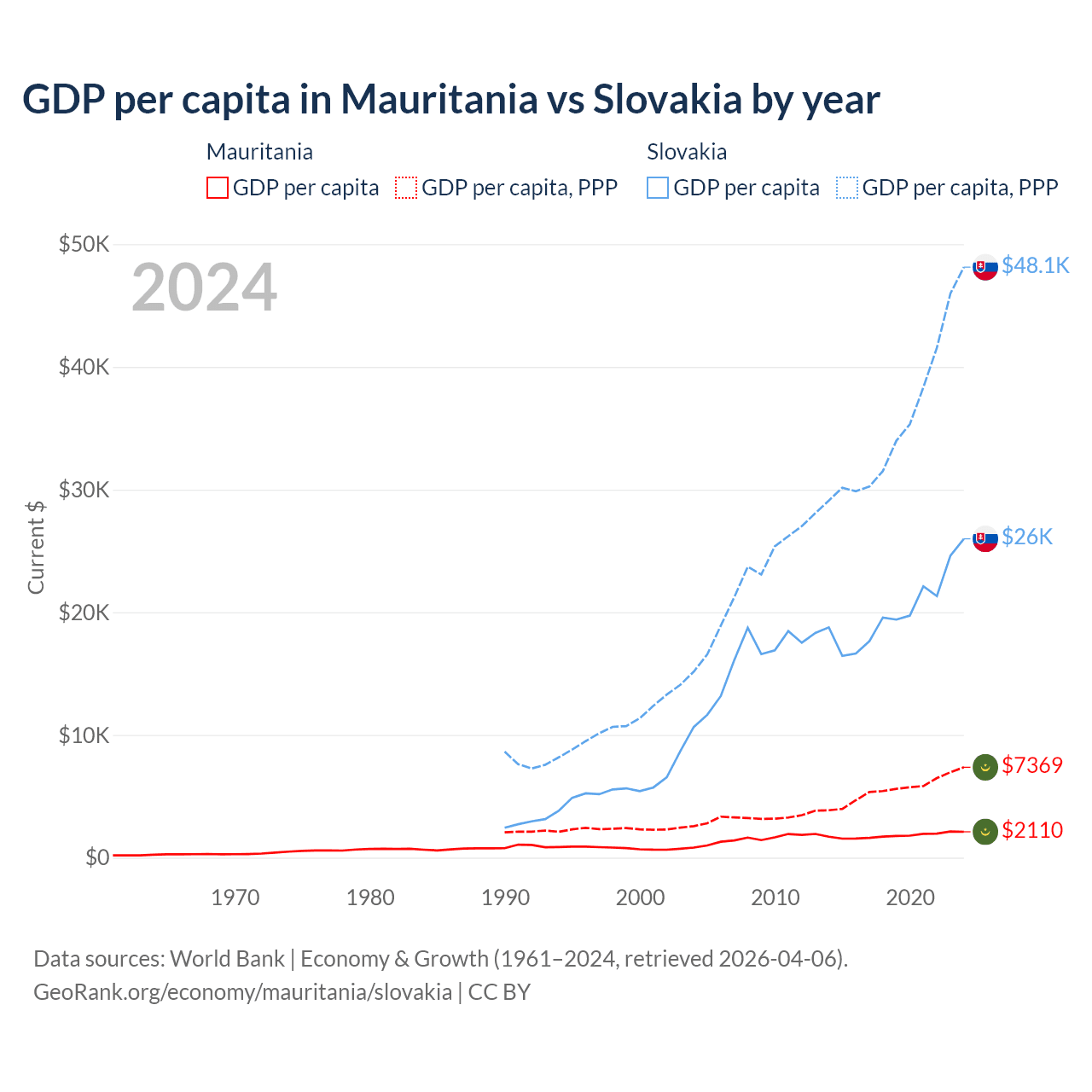 GDP per capita in Mauritania vs Slovakia by year