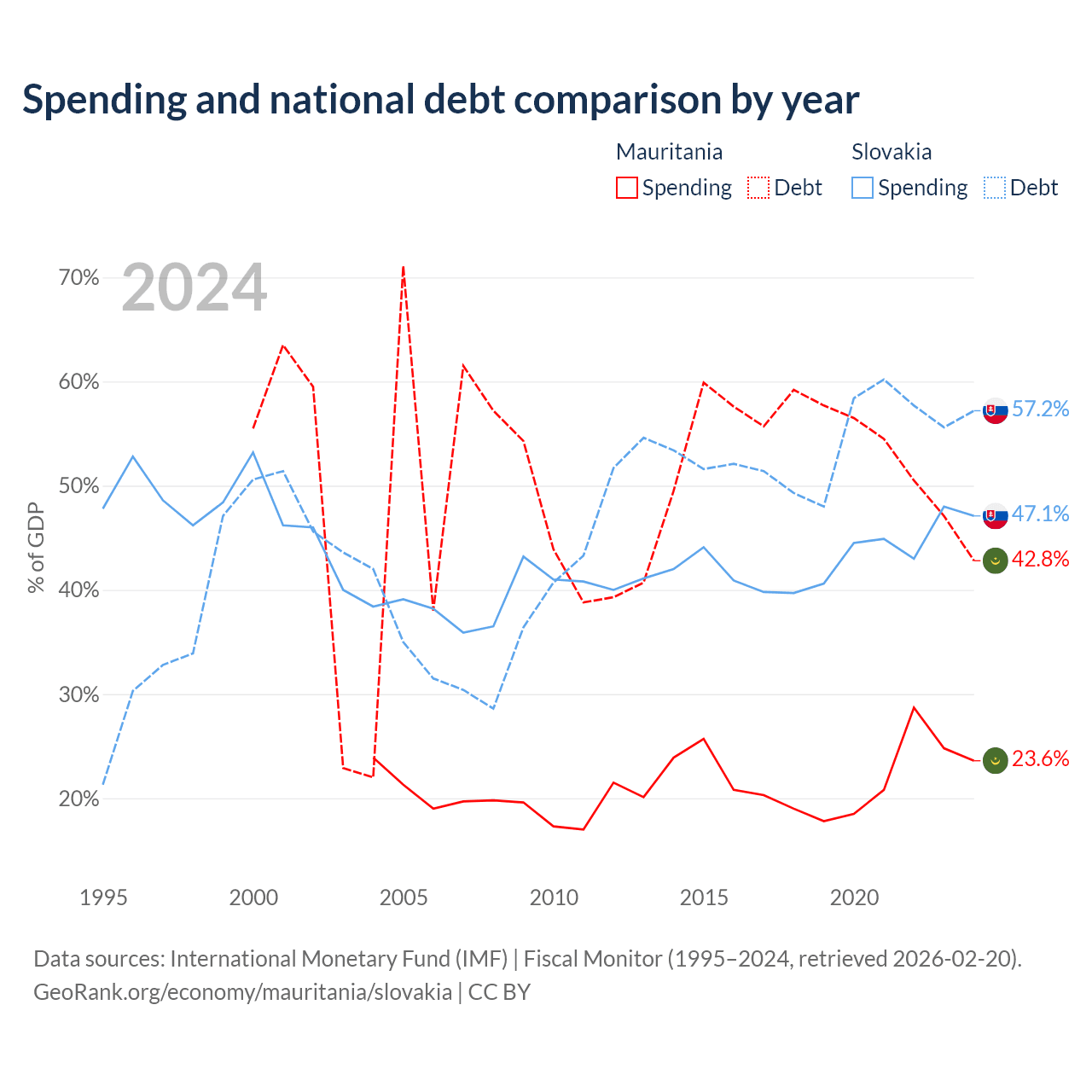 Mauritania has $4.67B in government debt (42.8% of GDP), compared to $80.7B (57.2% of GDP) in Slovakia.