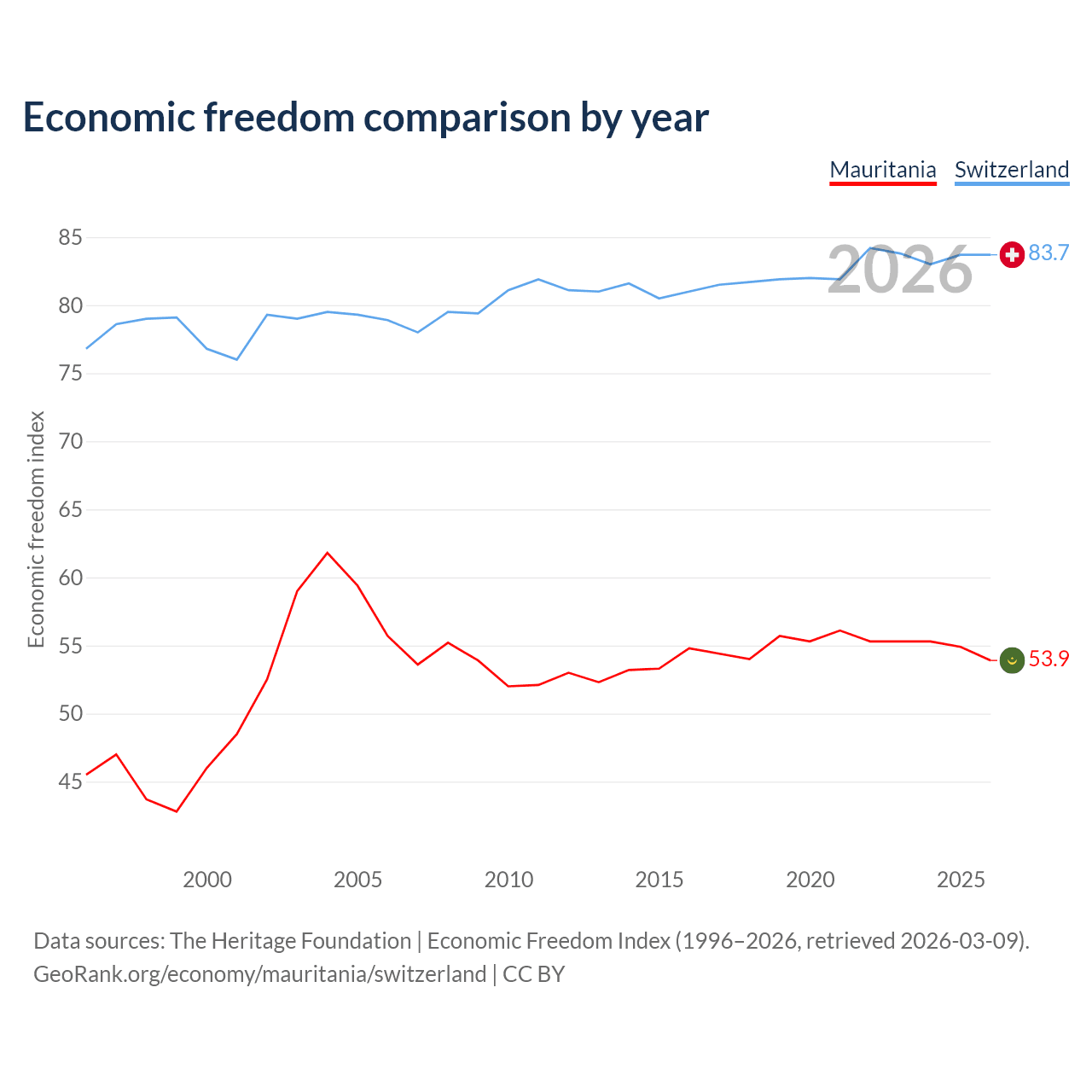 The Economic Freedom Index for Mauritania is 53.9, ranking 136/197, compared to 83.7 for Switzerland, ranking 2/197. The chart above displays a comparison of annual changes in economic freedom indexes.