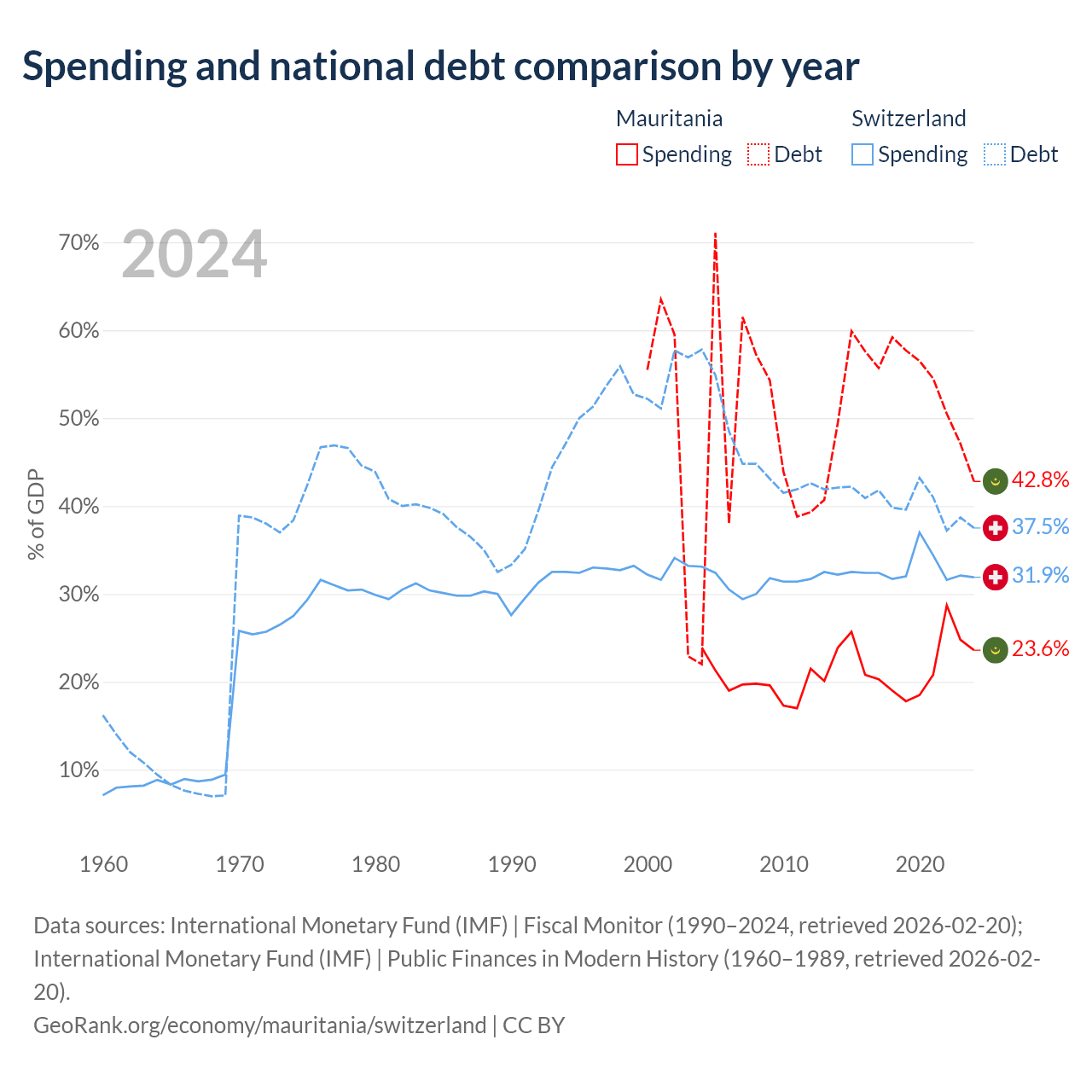 Mauritania has $4.67B in government debt (42.8% of GDP), compared to $351B (37.5% of GDP) in Switzerland.