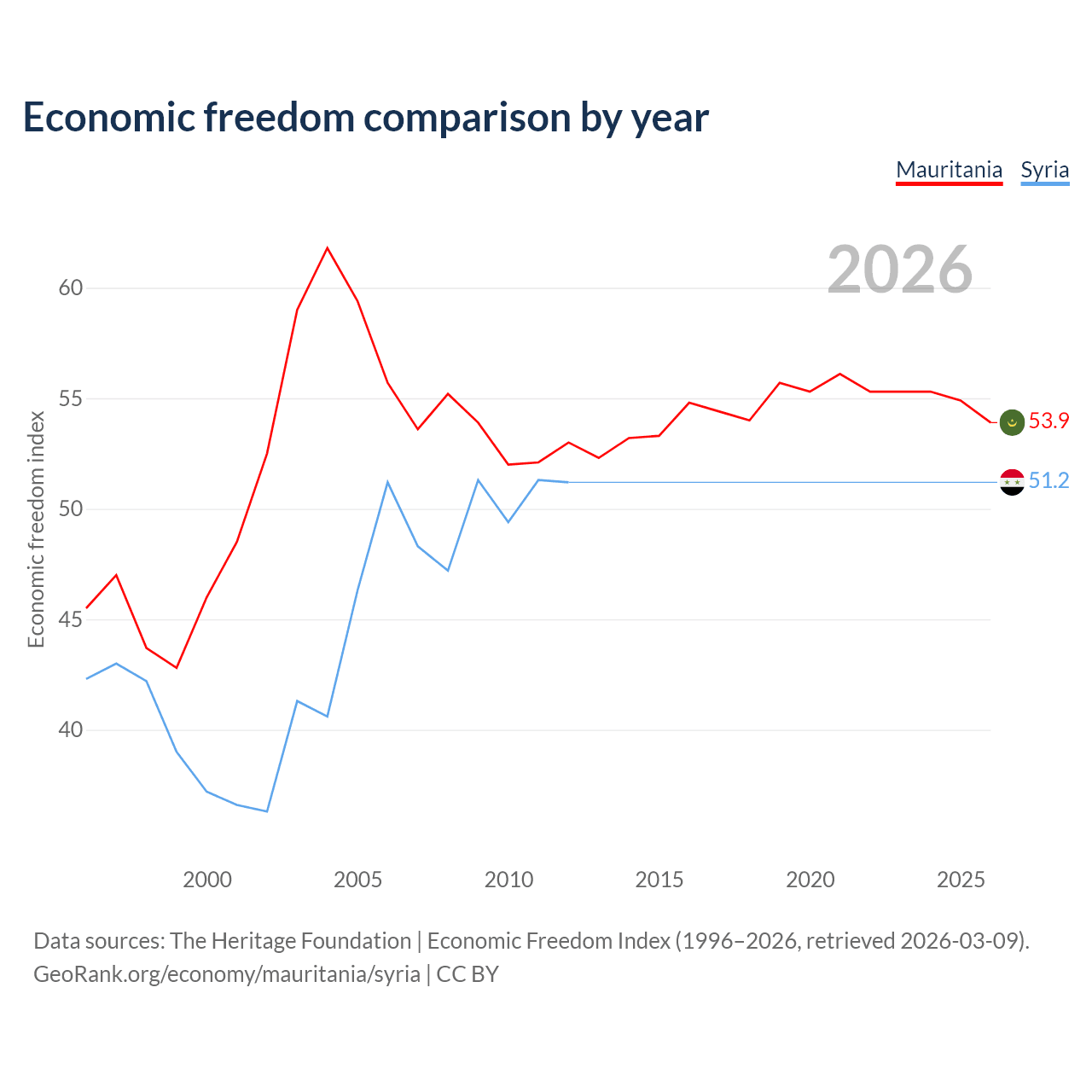 The Economic Freedom Index for Mauritania is 53.9, ranking 136/197, compared to 51.2 for Syria, ranking 155/197. The chart above displays a comparison of annual changes in economic freedom indexes.