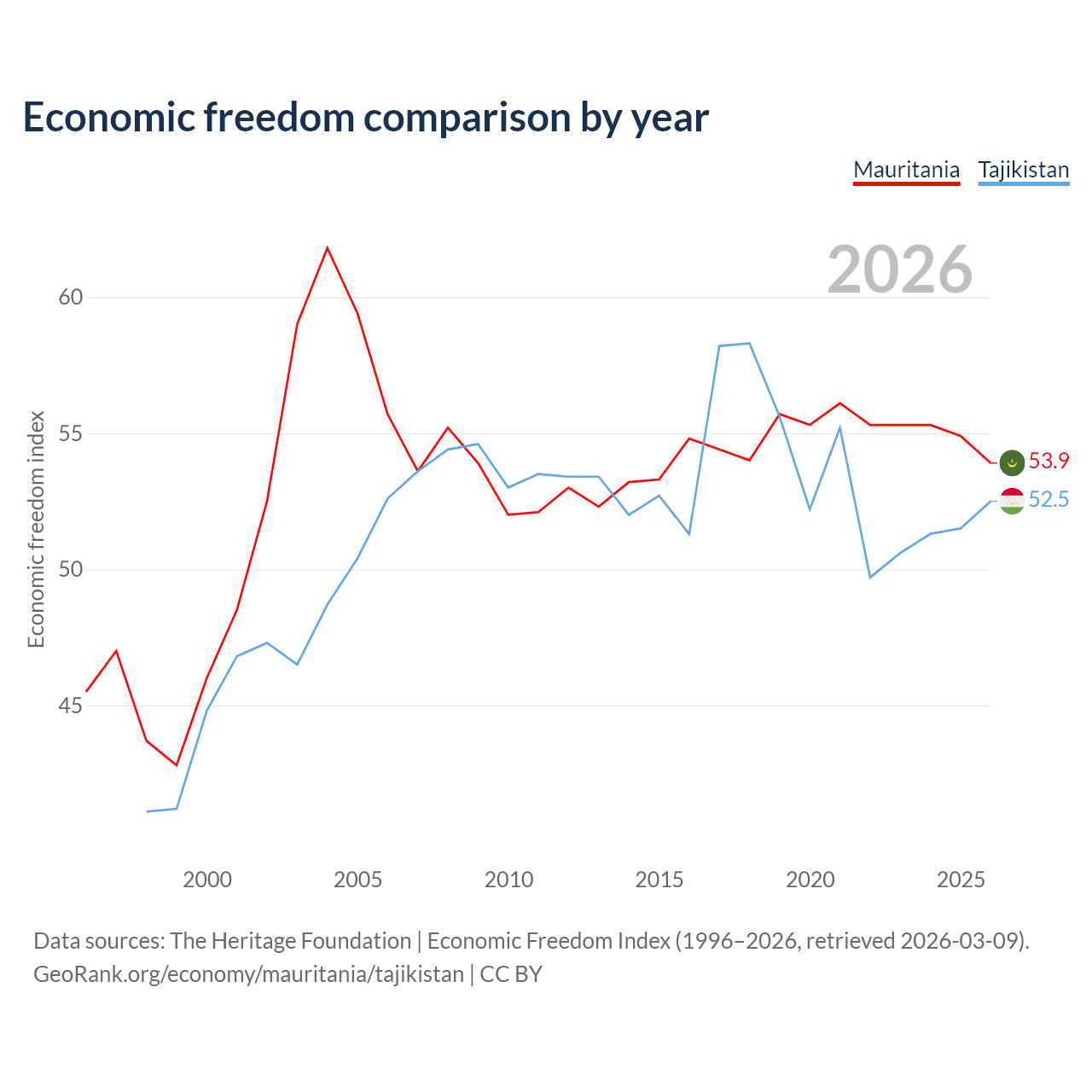 The Economic Freedom Index for Mauritania is 53.9, ranking 136/197, compared to 52.5 for Tajikistan, ranking 147/197. The chart above displays a comparison of annual changes in economic freedom indexes.