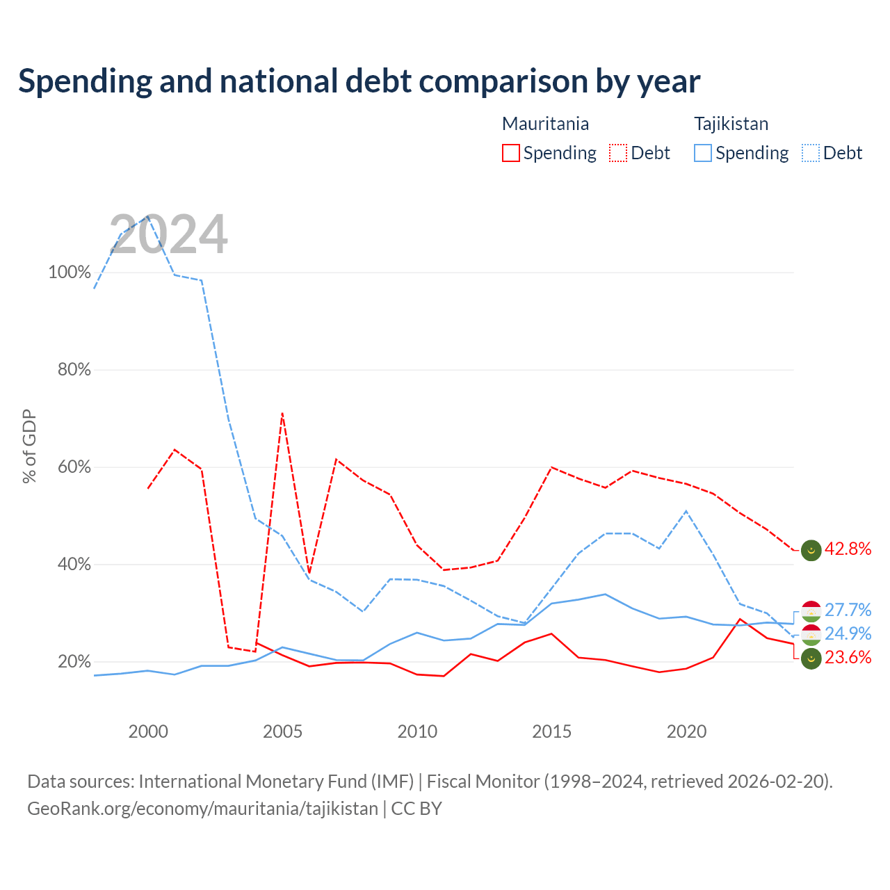 Mauritania has $4.67B in government debt (42.8% of GDP), compared to $3.54B (24.9% of GDP) in Tajikistan.