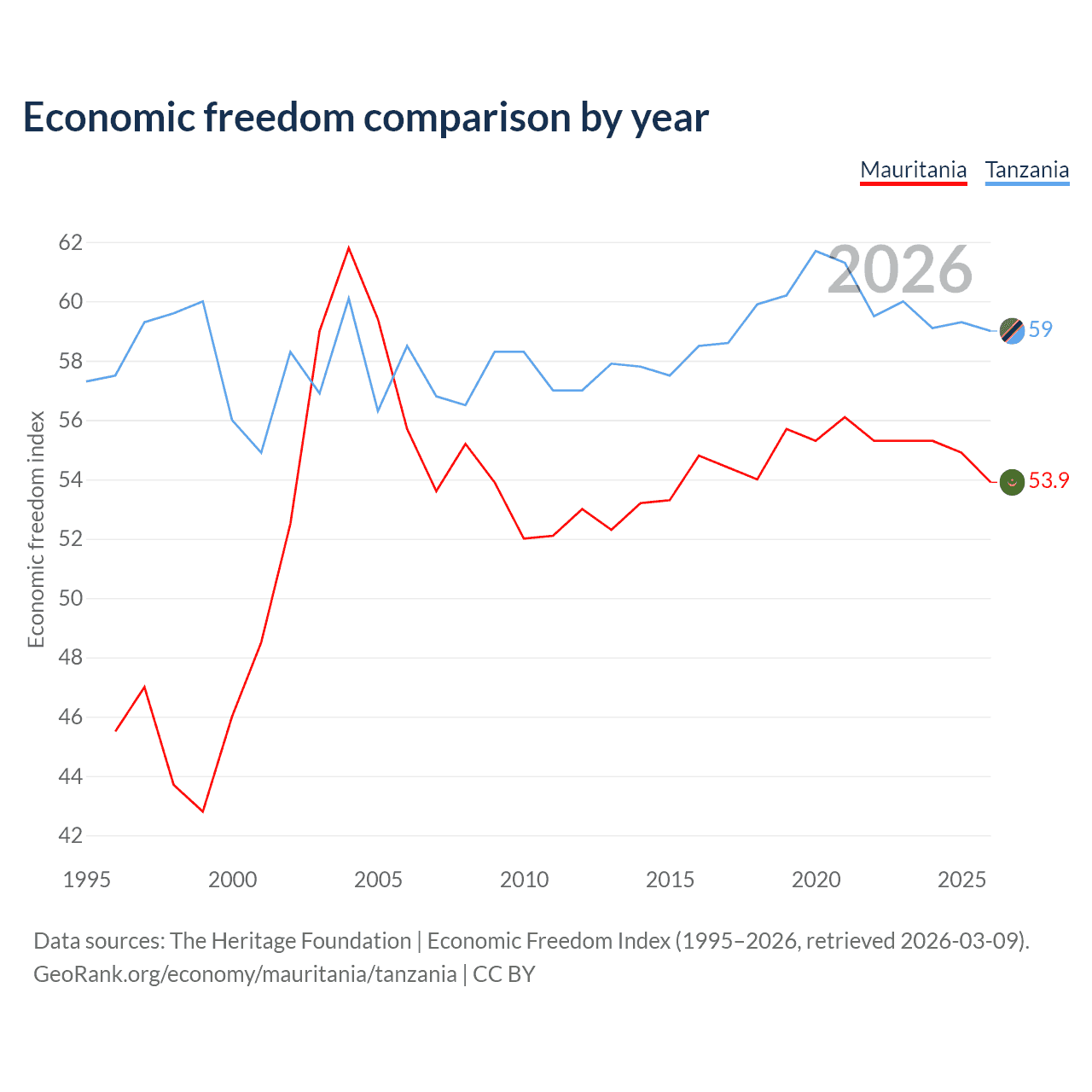The Economic Freedom Index for Mauritania is 53.9, ranking 136/197, compared to 59 for Tanzania, ranking 106/197. The chart above displays a comparison of annual changes in economic freedom indexes.