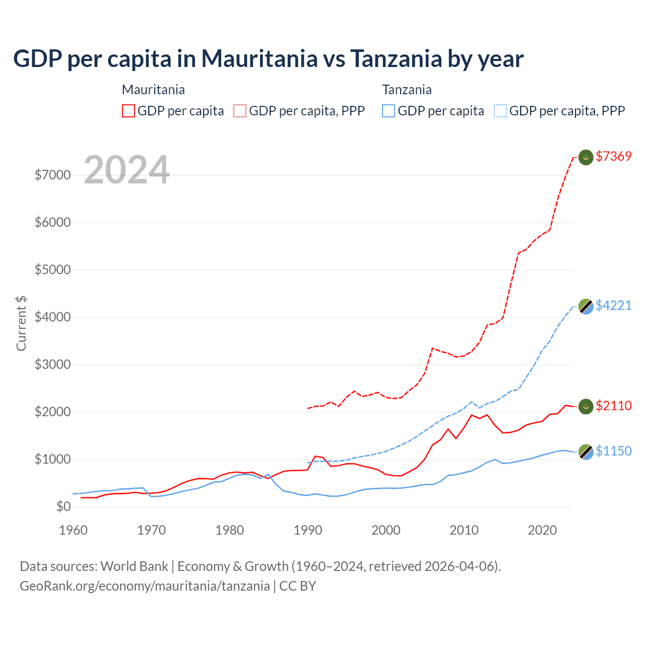 GDP per capita in Mauritania vs Tanzania by year