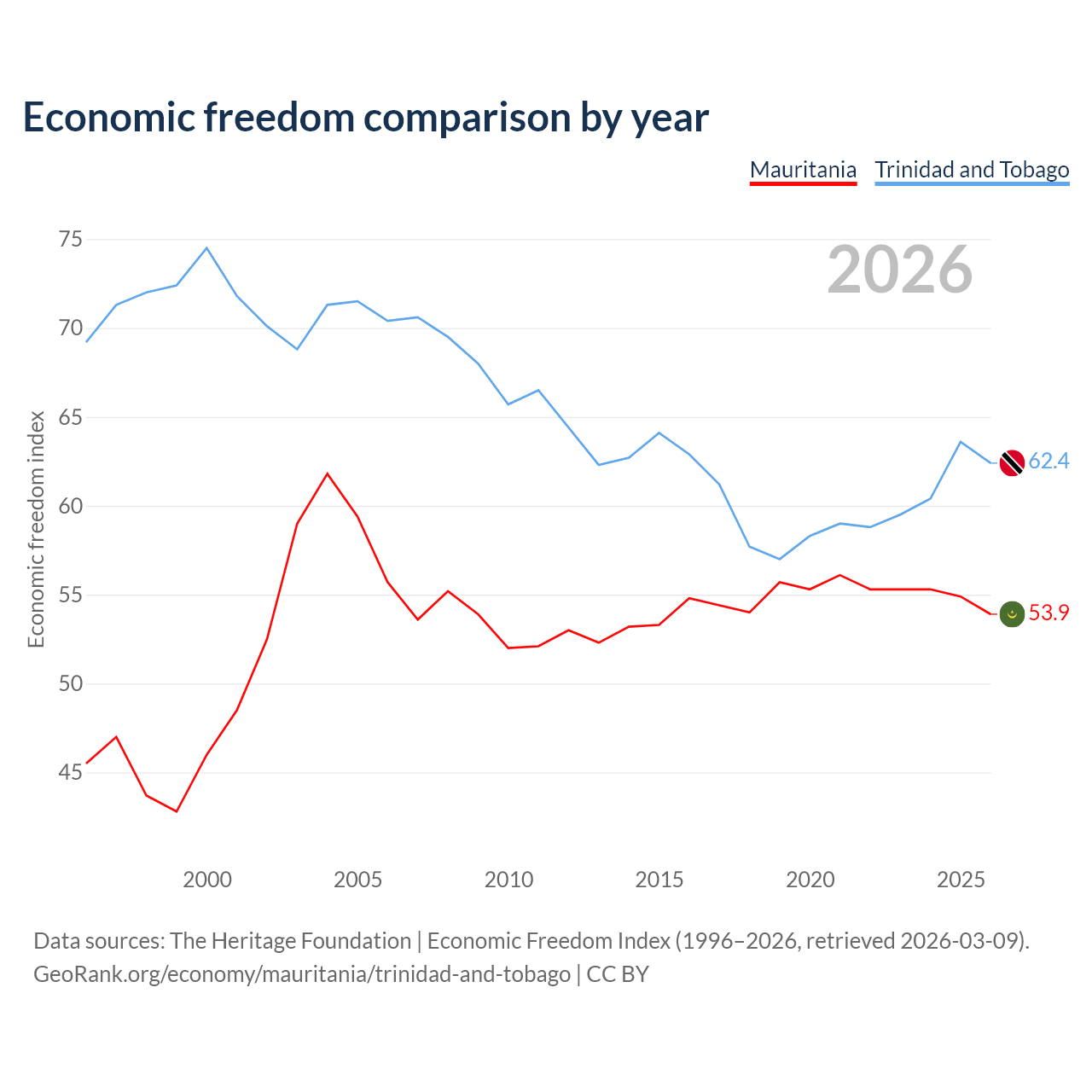 The Economic Freedom Index for Mauritania is 53.9, ranking 136/197, compared to 62.4 for Trinidad and Tobago, ranking 87/197. The chart above displays a comparison of annual changes in economic freedom indexes.