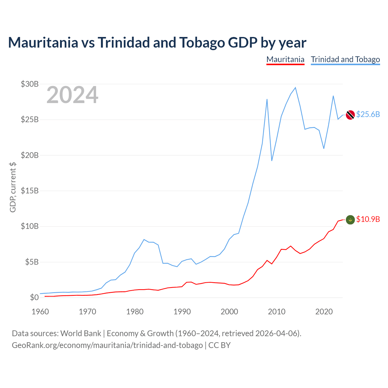 Mauritania has a GDP of $10.9B compared to $25.6B for Trinidad and Tobago, ranking 153/197 and 115/197 by economy size, respectively.