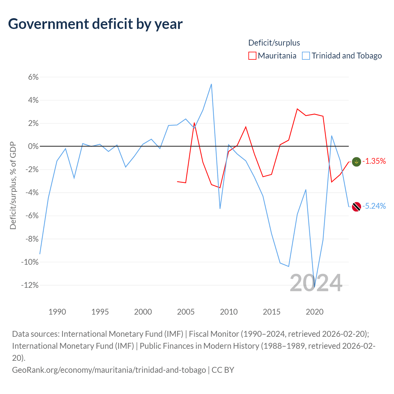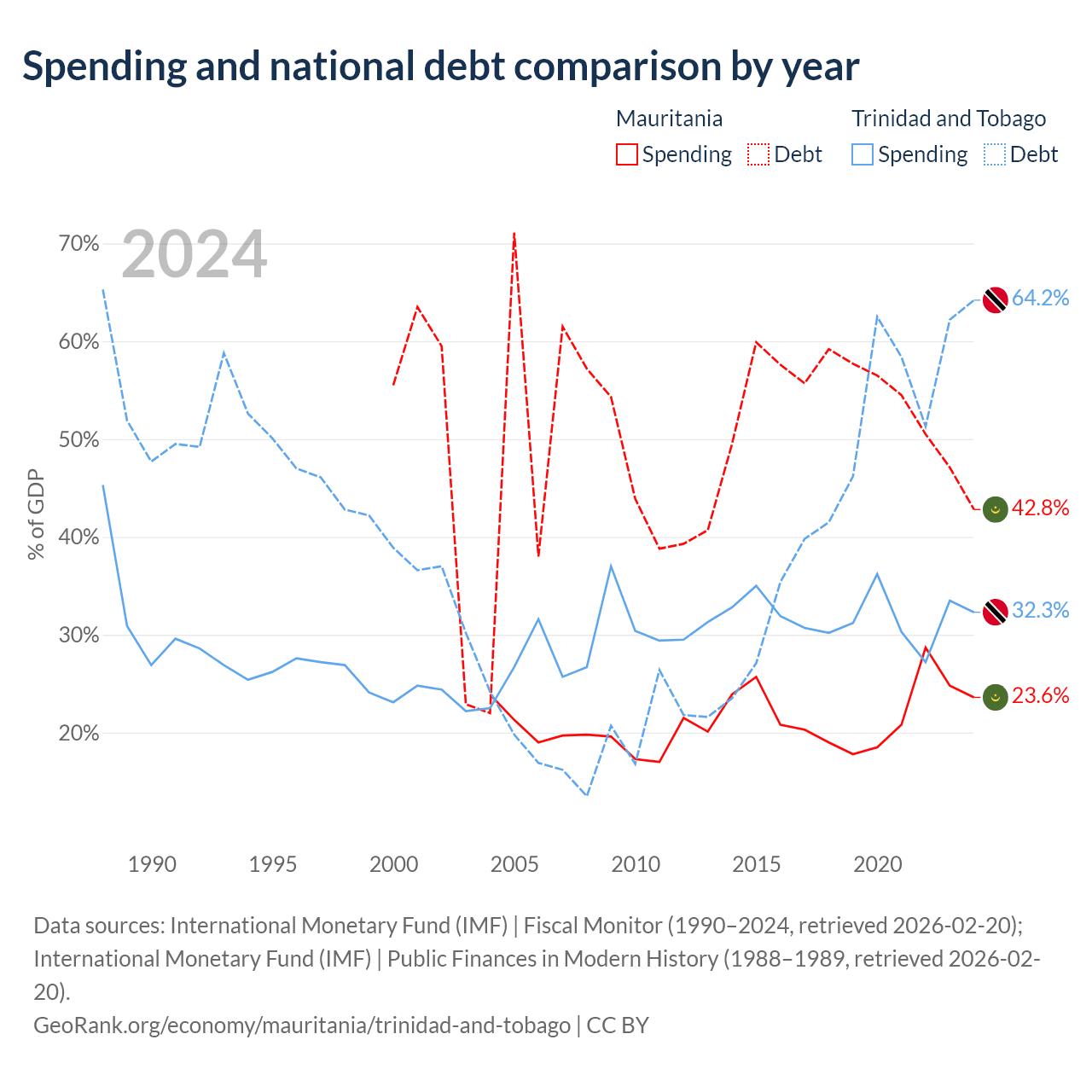Mauritania has $4.67B in government debt (42.8% of GDP), compared to $16.5B (64.2% of GDP) in Trinidad and Tobago.