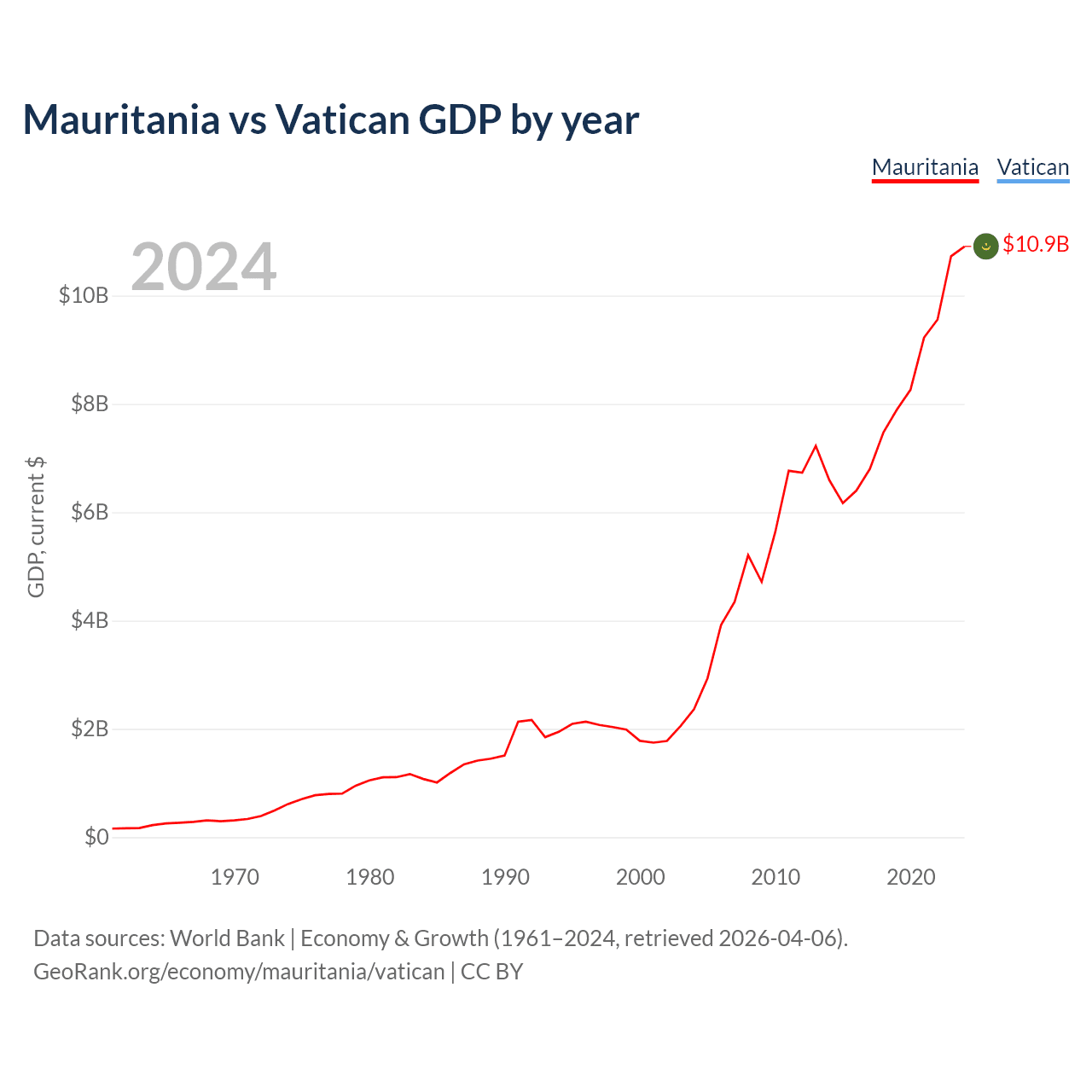 Mauritania has a GDP of $10.9B compared to $19.8M for the Vatican, ranking 153/197 and 197/197 by economy size, respectively.