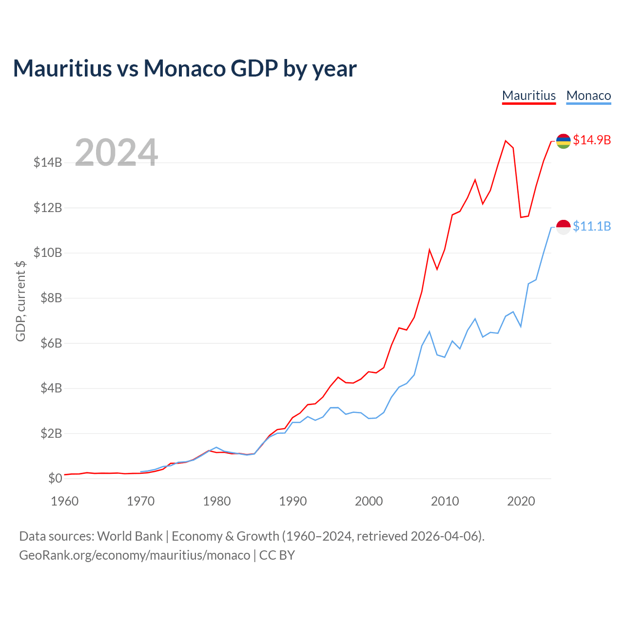 Mauritius has a GDP of $14.9B compared to $11.1B for Monaco, ranking 143/197 and 152/197 by economy size, respectively.