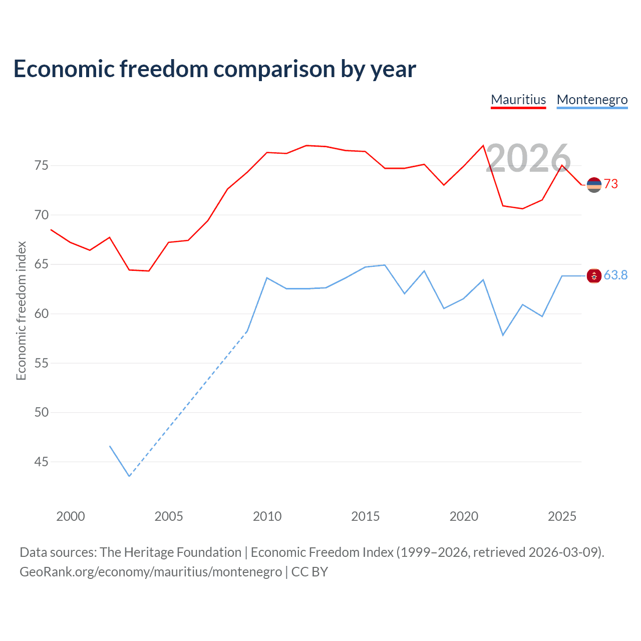 The Economic Freedom Index for Mauritius is 73, ranking 26/197, compared to 63.8 for Montenegro, ranking 78/197. The chart above displays a comparison of annual changes in economic freedom indexes.
